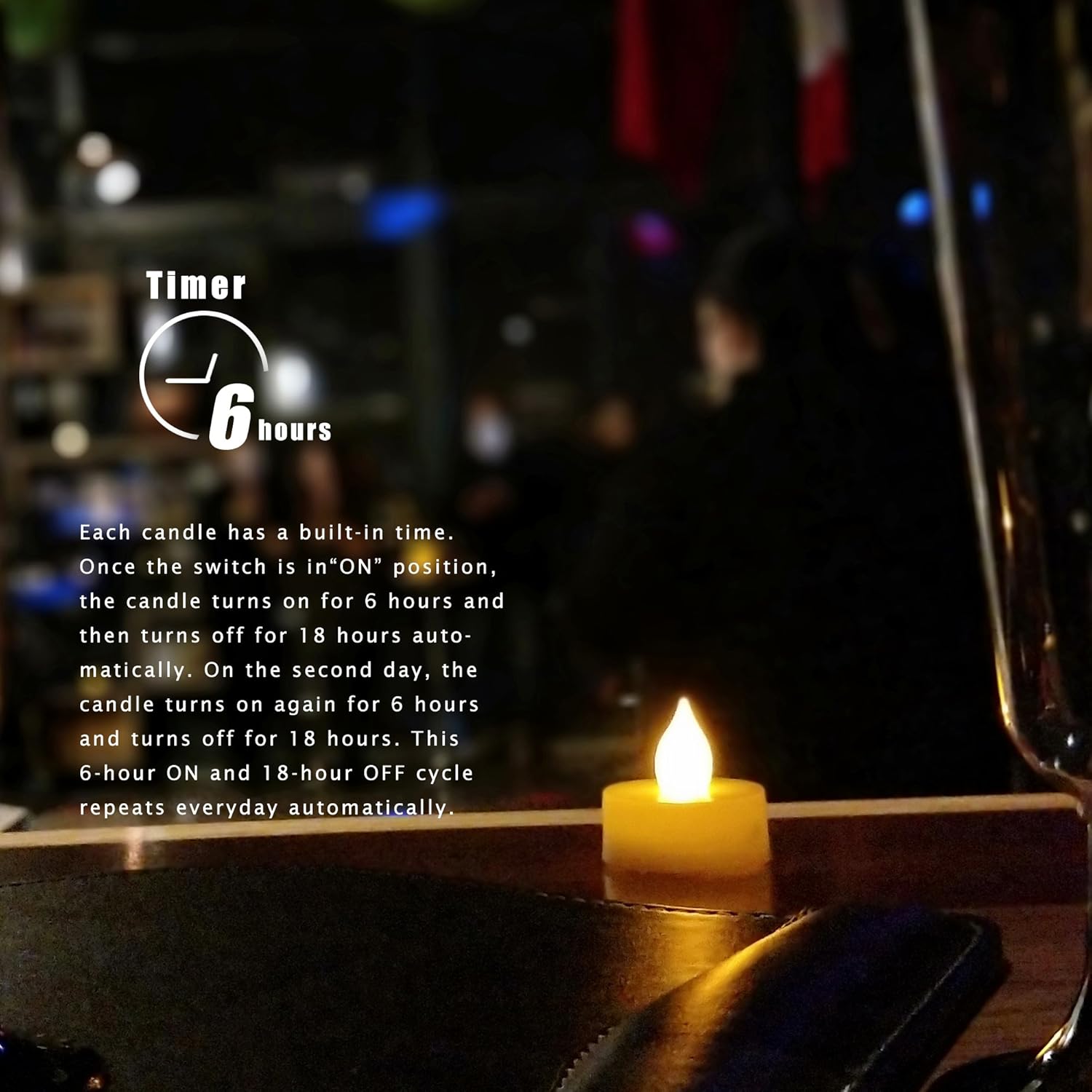 - 6-hour daily cycle timer. Once the LED votive candles / tea lights are turned on, they stay on for 6 hours and then turn off automatically for the next 18 hours. The auto timer function saves the trouble of turning on and off these flameless tea lights manually every day.