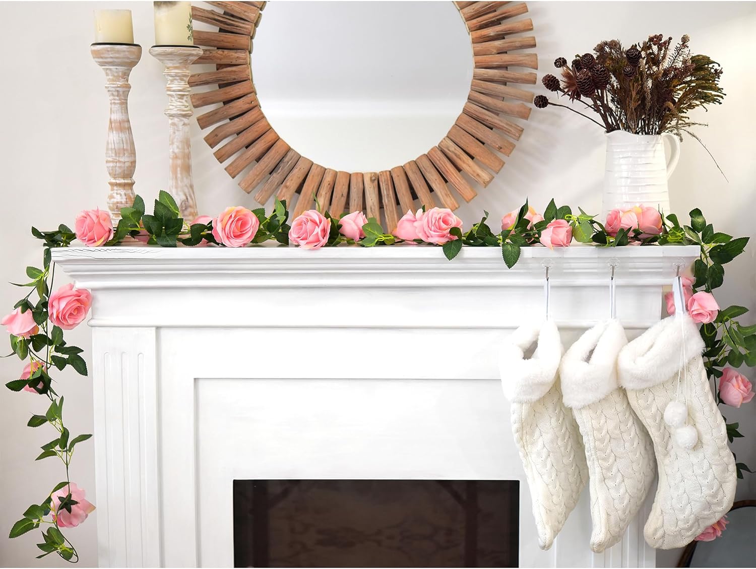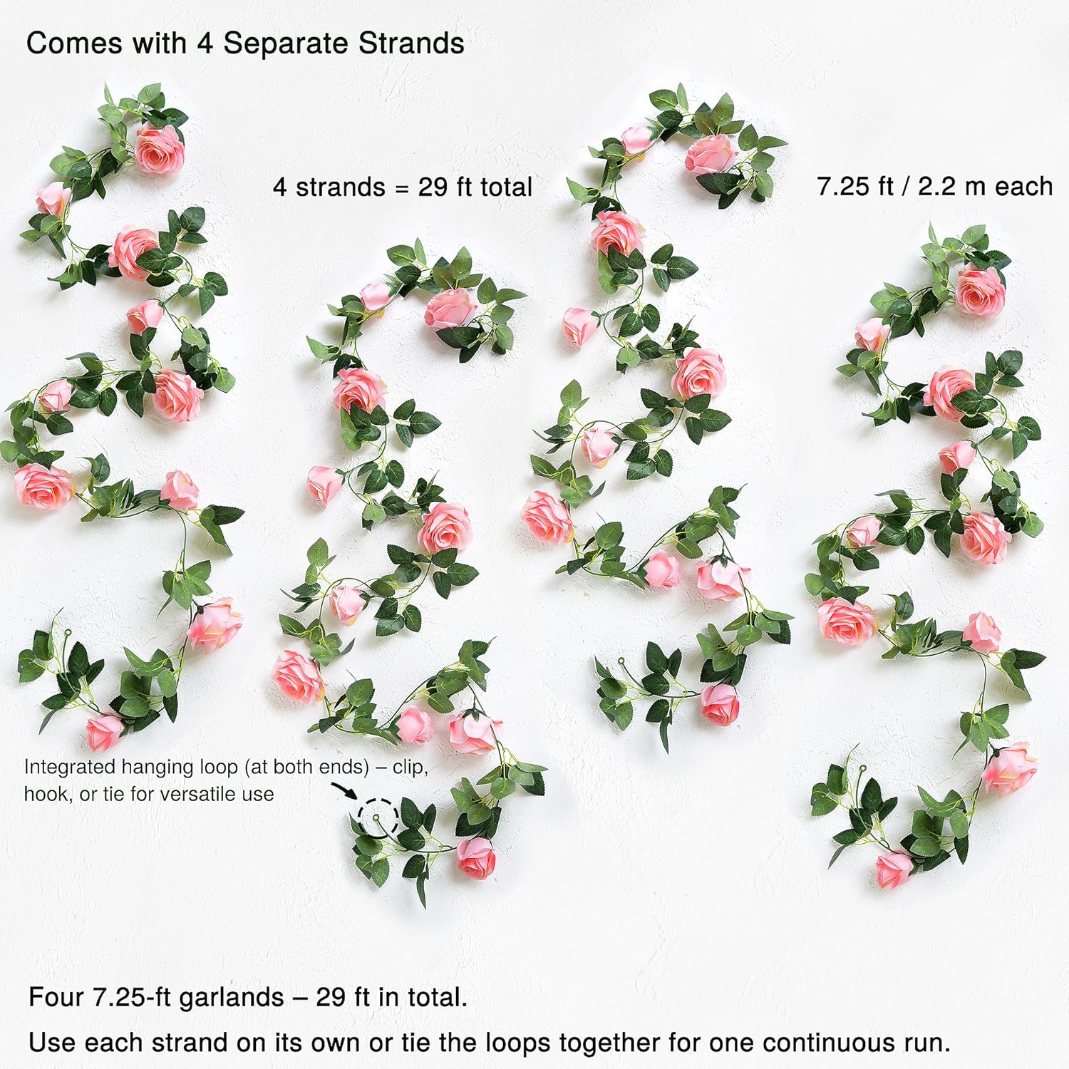 - Each strand has integrated loops at both ends for easy hanging—use individually or connect for a full-length display; Roses and leaves are made from soft silk blend with flexible PE vine; Color may vary slightly under lighting or monitor settings; Garlands may arrive compact due to packaging—please fluff gently to restore volume; Petal shedding may occur during unpacking and is normal; Ships in protective FiveSeasonStuff branded packaging.