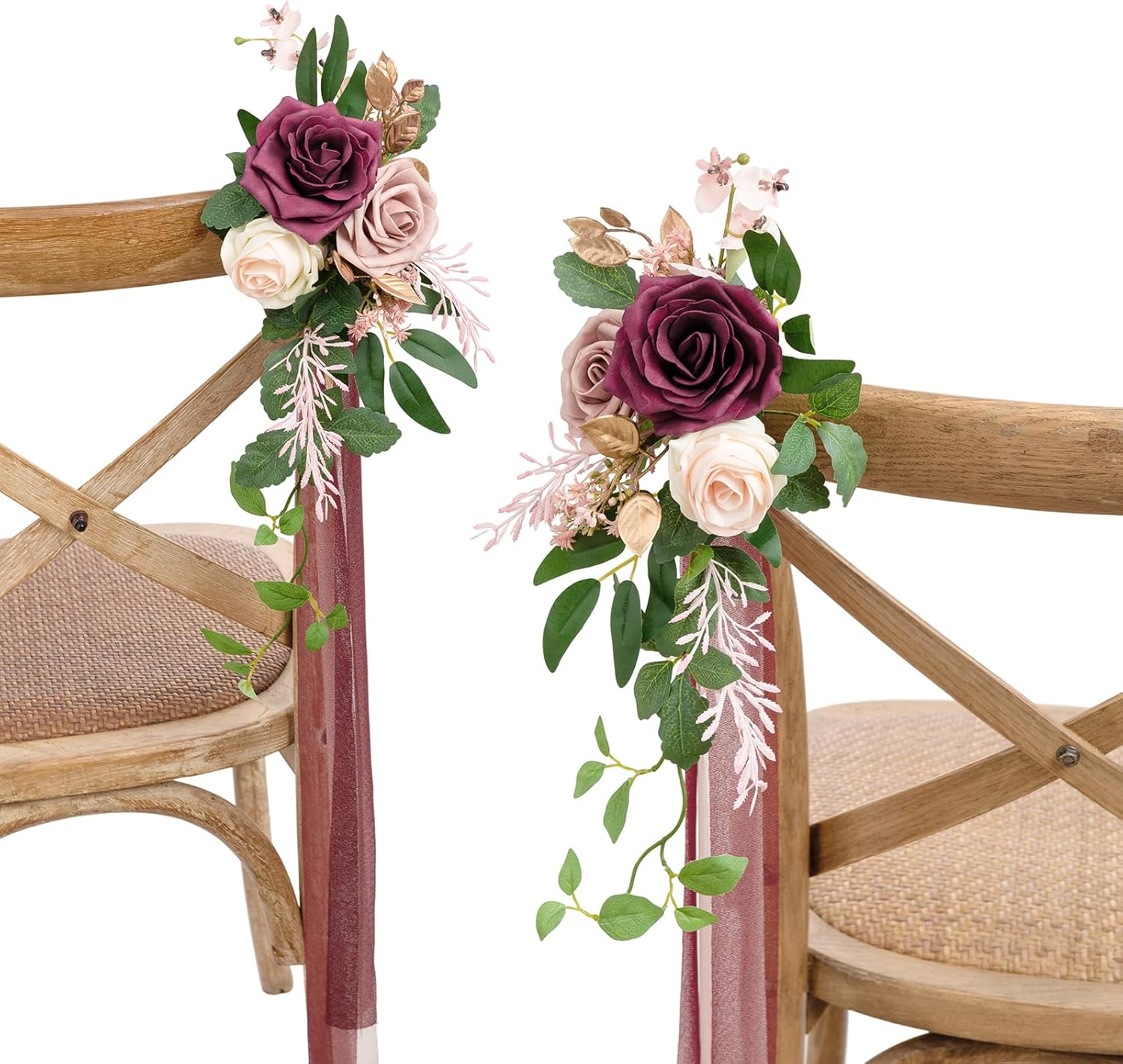 - WEDDING AISLE DECOR DETAILS: 8 pcs pre-made fake aisle marker pew flowers and 8 double-color ribbon card sets, which helps to create your romantic fall, marsala or winter wedding. Aisle suitable for four rows of guest seating. If there are more queues, it is recommended to purchase multiple copies.