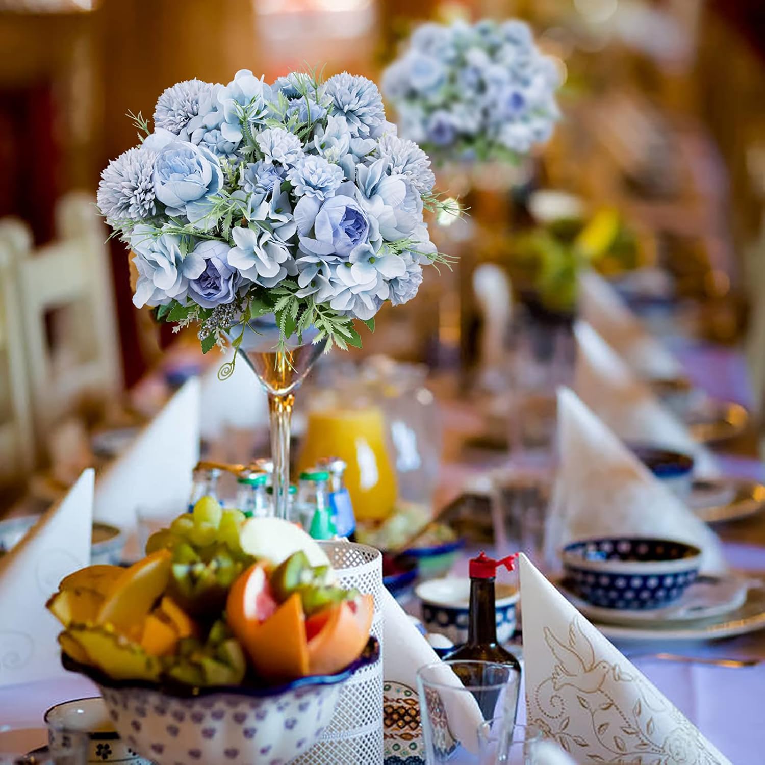 - 【What DoYou Get】 You will get 4 piece of blue realistic fake flowers. Each bunch has 7 stems with silk soft hydrangea, peonies, carnations, several flower bubbles, plastic grass and bushy leaves (vase not included).