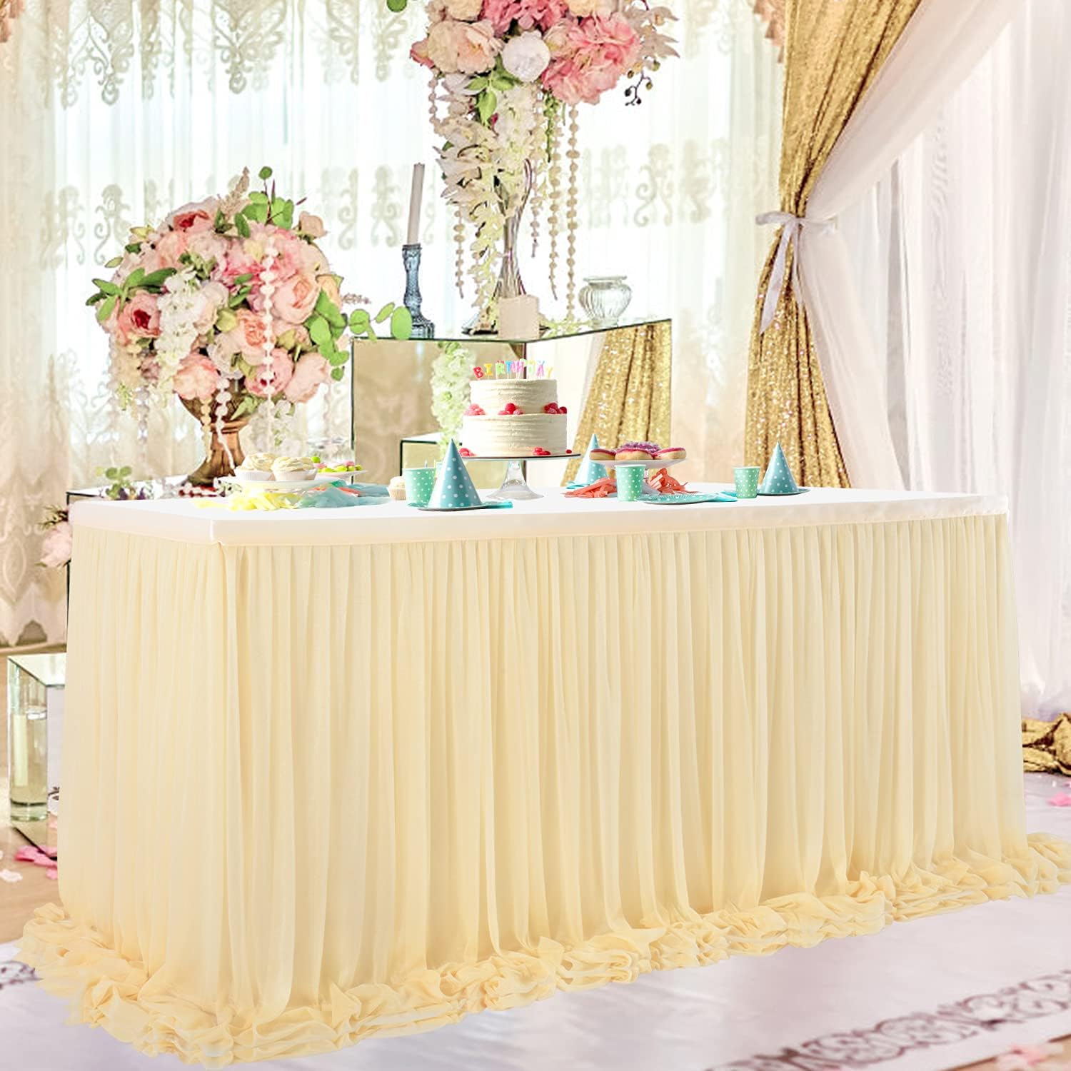 - Wide range of use: champagne fluffy rectangle table skirt perfect for rectangle table,round table, baby shower decorations, home decoration, birthday party, baby 1st birthday party, wedding, wedding reception, cake table decorations, holiday parties, mermaid birthday party table decorations, Buffet Banquet Table Decorations, etc.