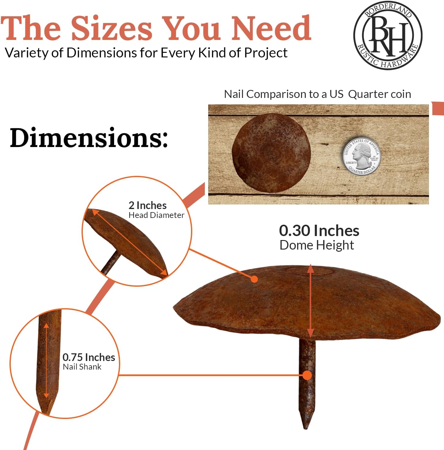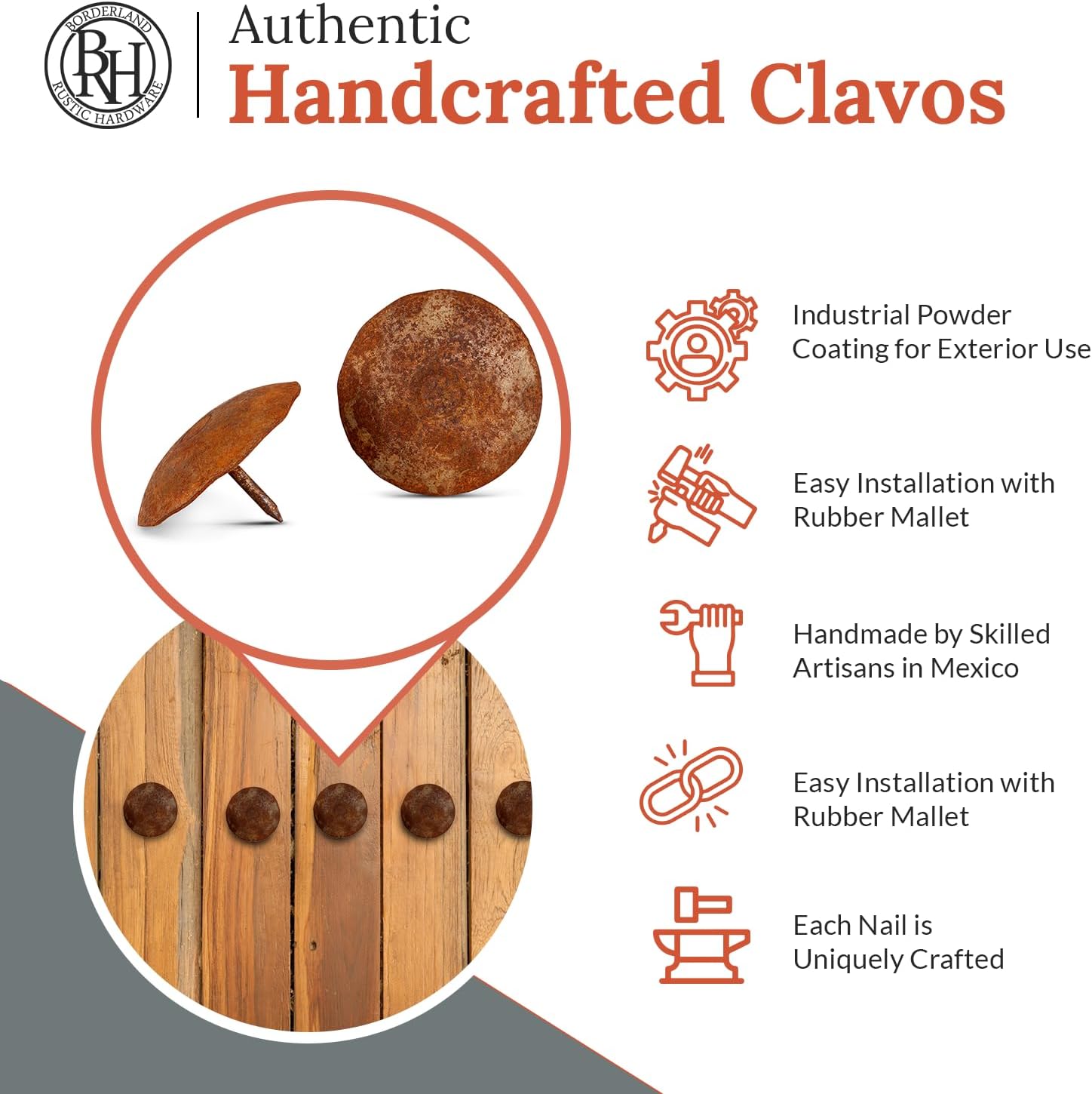 10 Pack 2" Round Head Iron Clavos Decorative Nails – Rusted – Handmade Rustic Round Fasteners for Farmhouse Shutters, Faux Wood Beams, Barn Doors, Shutters, Gates – Ornamental Wood Accent