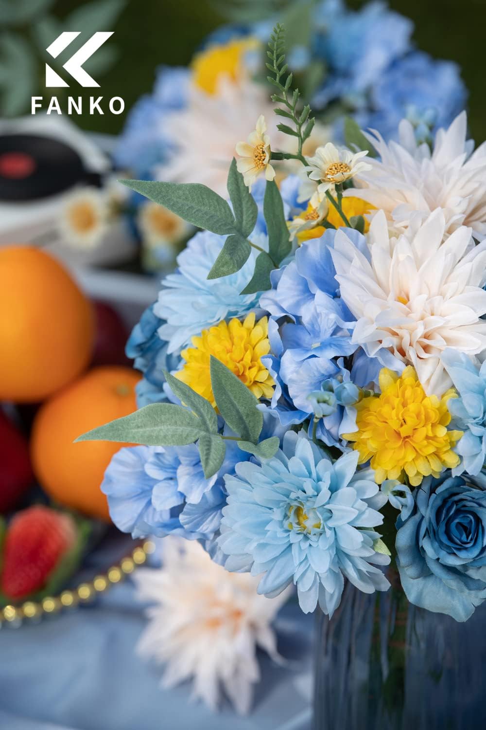 - 【47Pcs in Package】Our artificial flowers combo includes: Cream Semi-Cactus Dahlia x 2 (5.5"), Sky Blue Dahia x 4(4"), Dusty Blue Silk Rose x 5(3.5"), Hydrangea Flowers x 3 (4.5"), Yellow Chrysanthemum Ball x 4(2.5"), Daisy x 12 (1.5"), Rose Buds x 12(0.5"), With Leaf x 3, Nandina Plants x 2. [Notes: Ribbons are not included. Colors may vary slightly due to differences in monitor settings.]