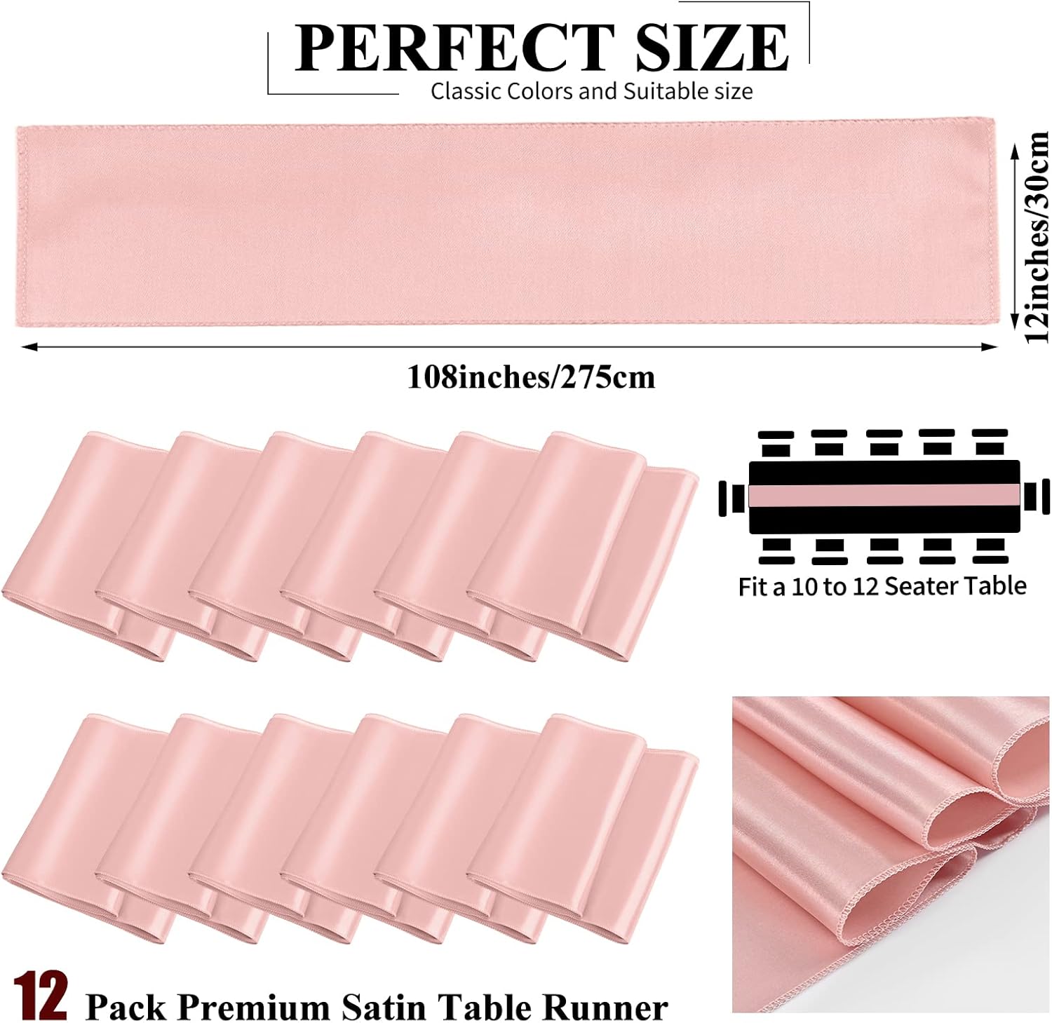 - 🍰【Set includes】12Pack rose gold satin table runner measures 12" x 108" in size, appropriate for a table that can seat 8-10 people. This satin table runner can fit a 6ft/8ft rectangular table or round table well.This satin table runner is great for event table decorations.Our satin table runner make your dining table more dazzling and outstanding.Purchase our 12piece satin table runner and save even more.