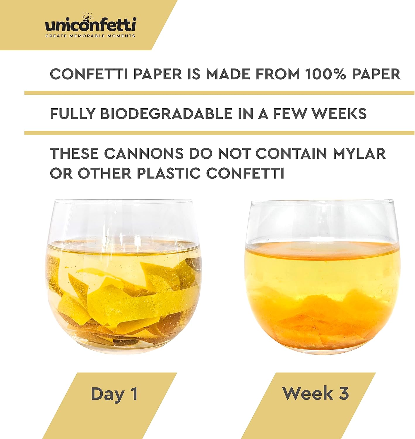- š 100% BIODEGRADABLE [NOT PLASTIC] - GOLD Confetti is made of lightweight fire resistant tissue papers, 100% biodegradable, most venues will approve. Our GOLD Confetti Paper is NOT PLASTIC or PVC. 100% safe for your party and good for the environment.