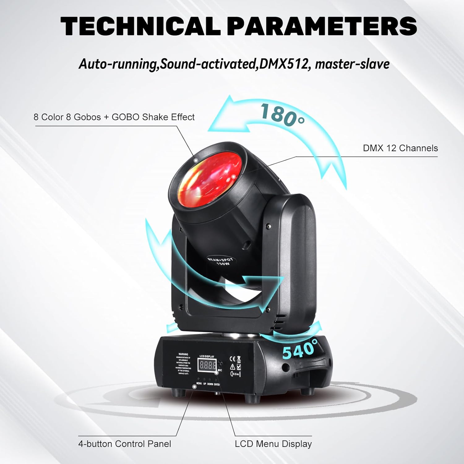 - ♬【Function parameter】 LED Source: 150W White LED, DMX channel:12 channels, Effect. Movement: Pan: 540°,Tilt: 180°Control mode: Auto, Sound, DMX, Master/Slave