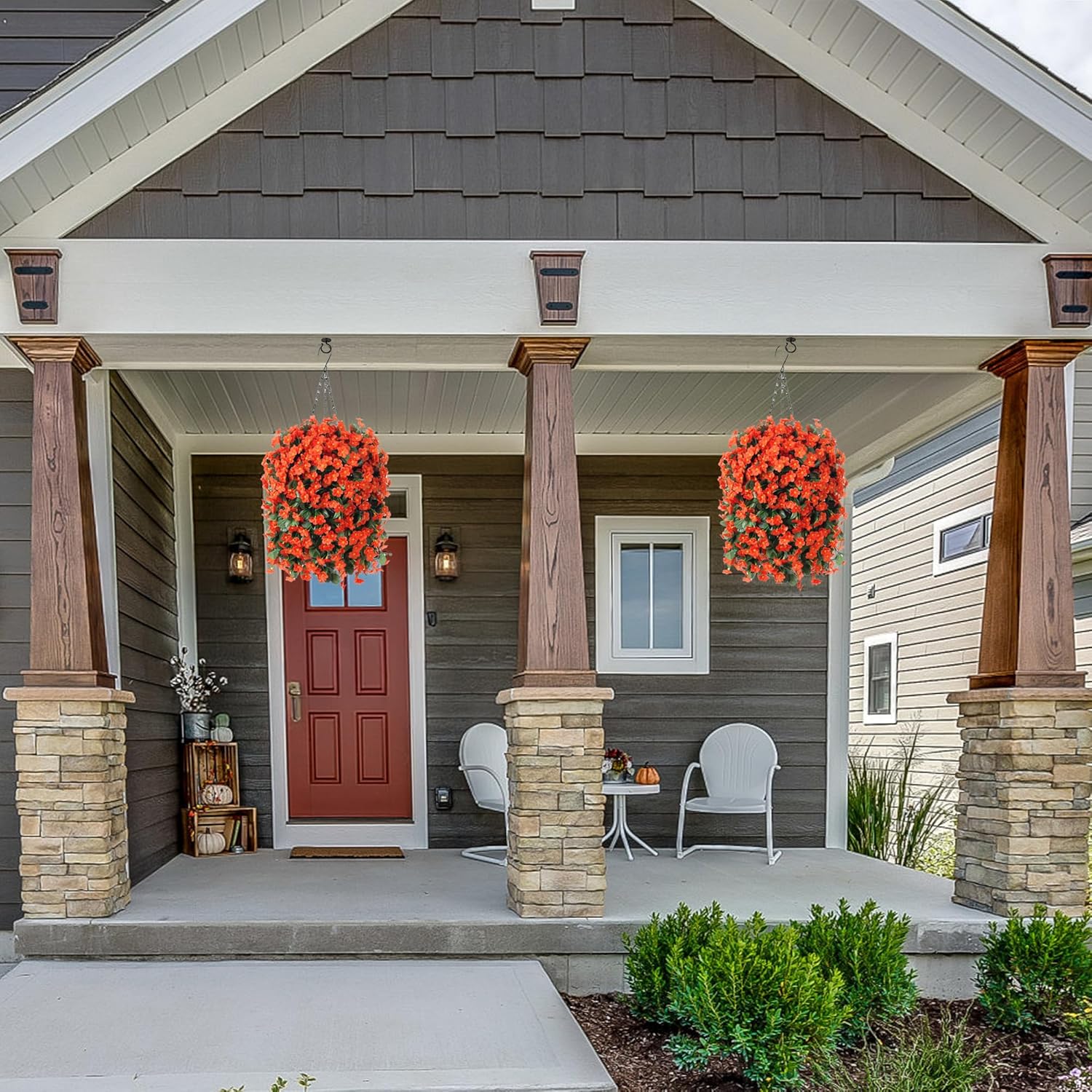 Artificial Fake Fall Hanging Flowers Plants Baskets for Autumn Outdoor Outside, Faux Silk Orange Orchid in Planter UV Resistant for Home Porch Garden Yard Patio Decor