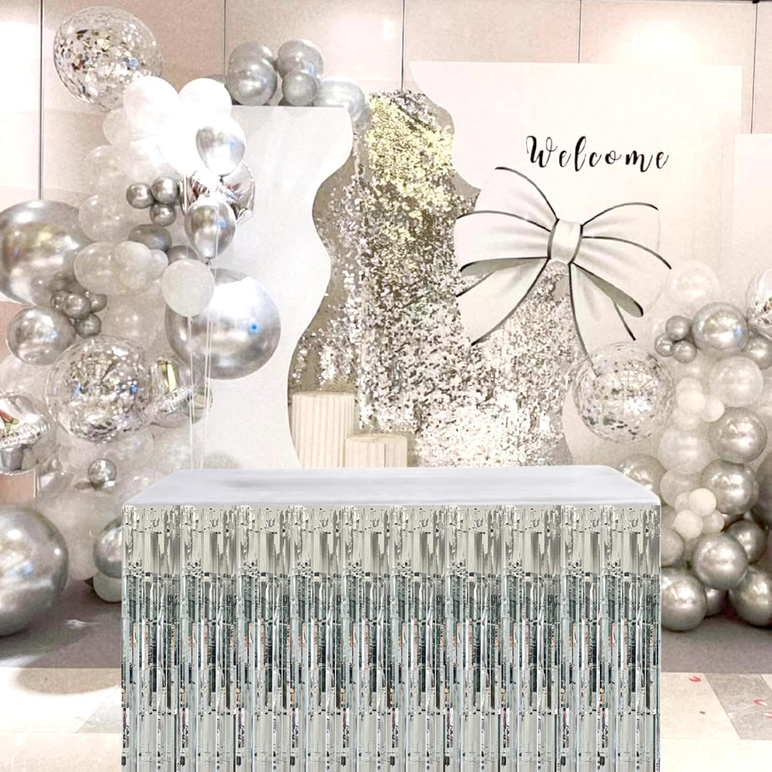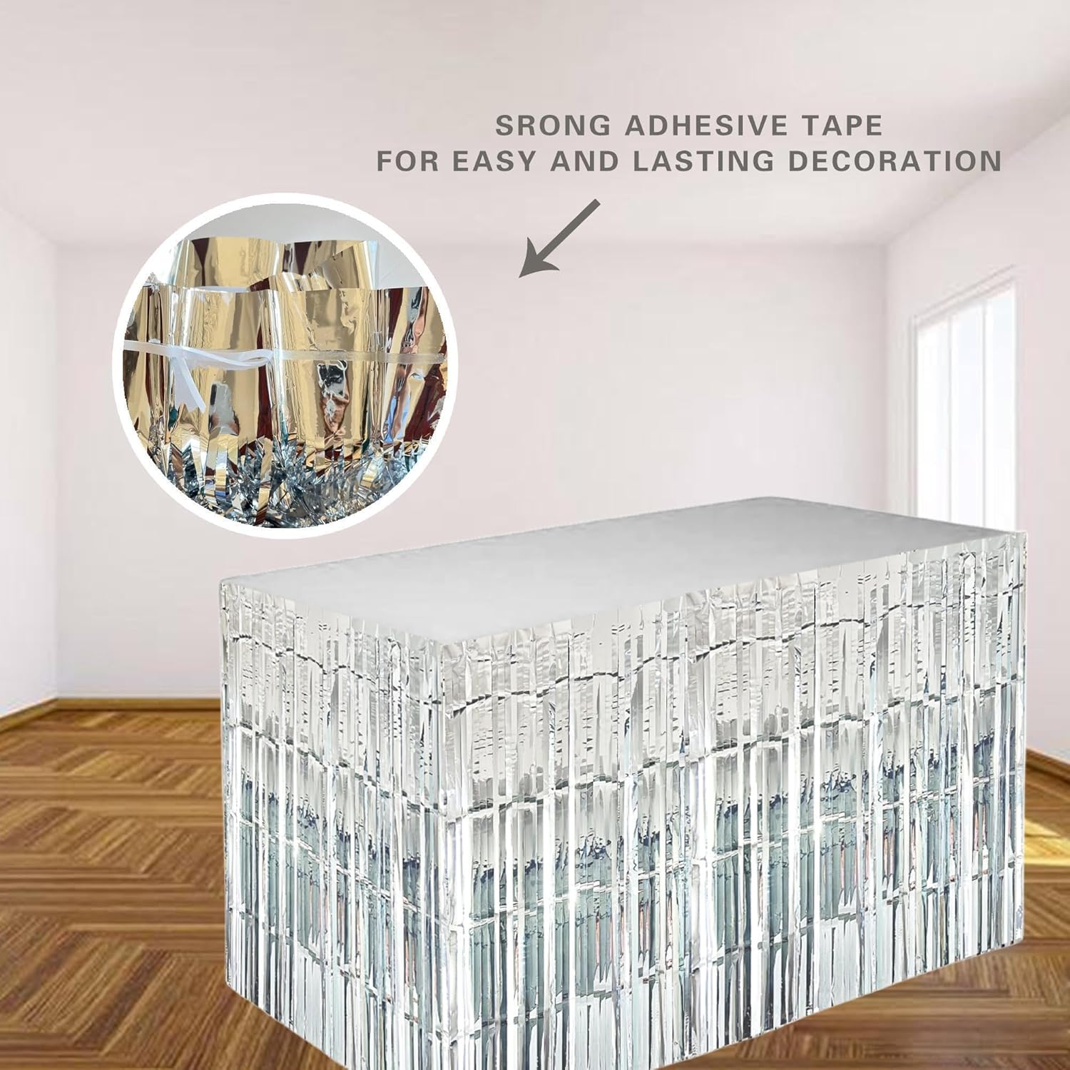 - 【PAKAGE WELL AND PROPER SIZE】Set of 2, enough quantity for your silver party decorations, save money. Each pack of table skirt measures 29x108 inches. Each one will be 9 Ft long, 4 pack will cover 36 FT length of tables. These foil table skirts are easy to attach to your table.