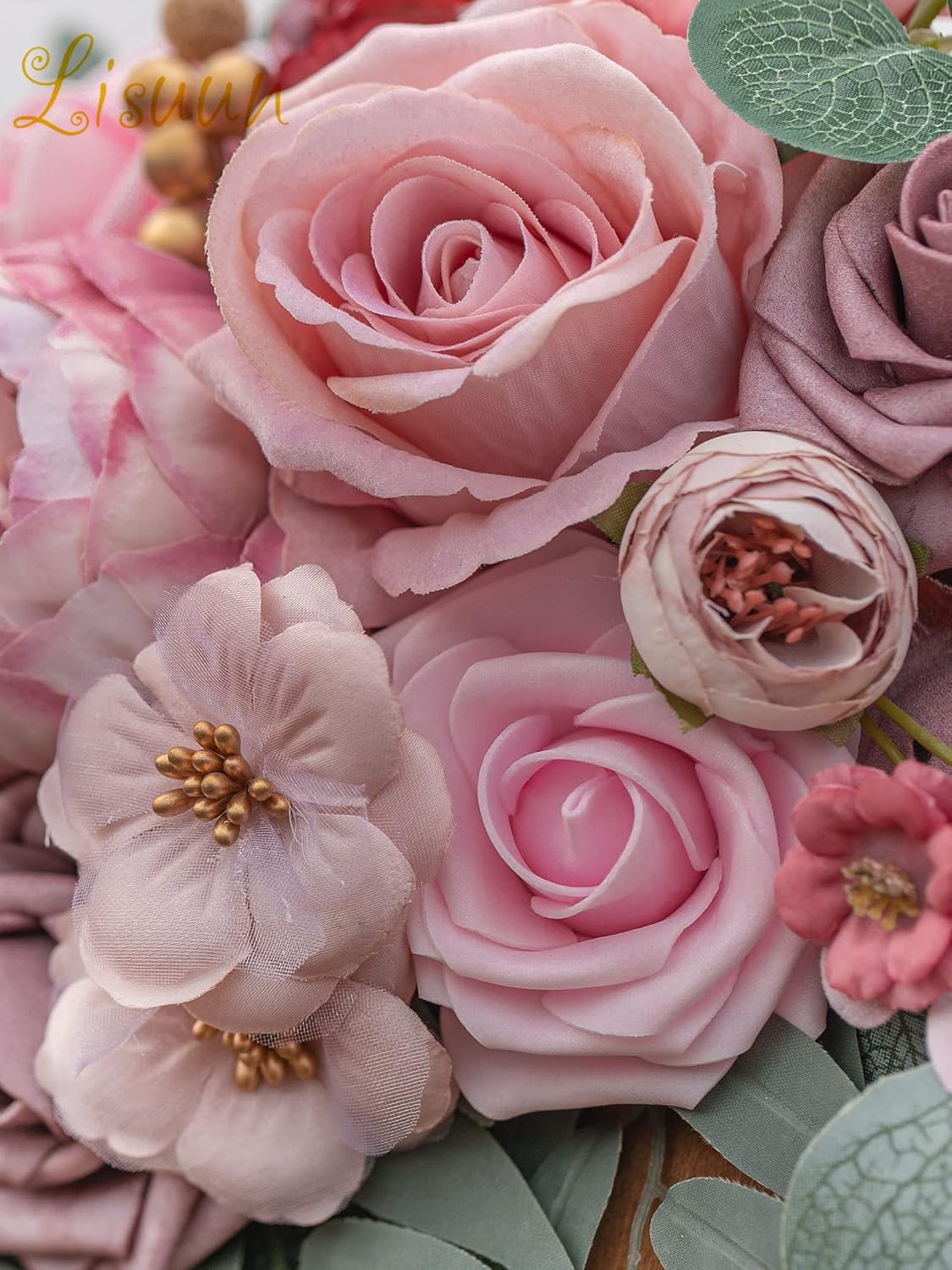 - Premium Materials:The floral swag is made of high-quality silk,and the main flower is composed of blush pink austin rose,light brown dahlia pinnata,dusty gerbera,which are perfectly matched with more than ten kinds of small flowers,leaves,and green vines.They are durable,soft,plump,beautiful and lifelike.
