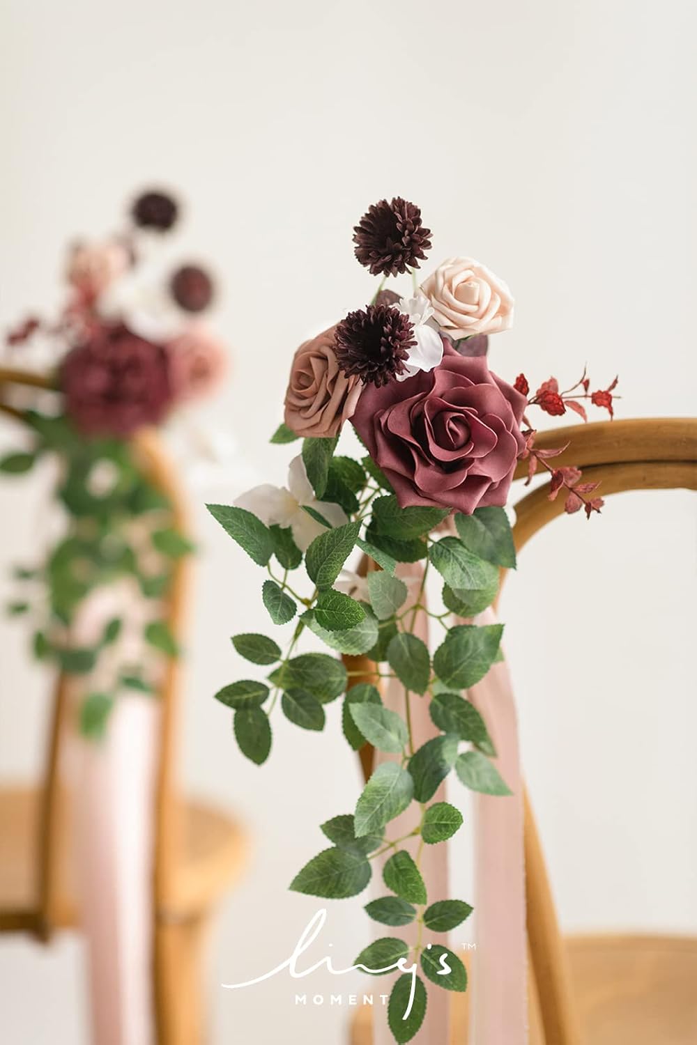 - WEDDING AISLE DECOR DETAILS: 8 pcs pre-made fake aisle marker pew flowers and 8 double-color ribbon card sets, which helps to create your romantic spring, dusty rose mauve or summer wedding. Aisle suitable for four rows of guest seating. If there are more queues, it is recommended to purchase multiple copies.