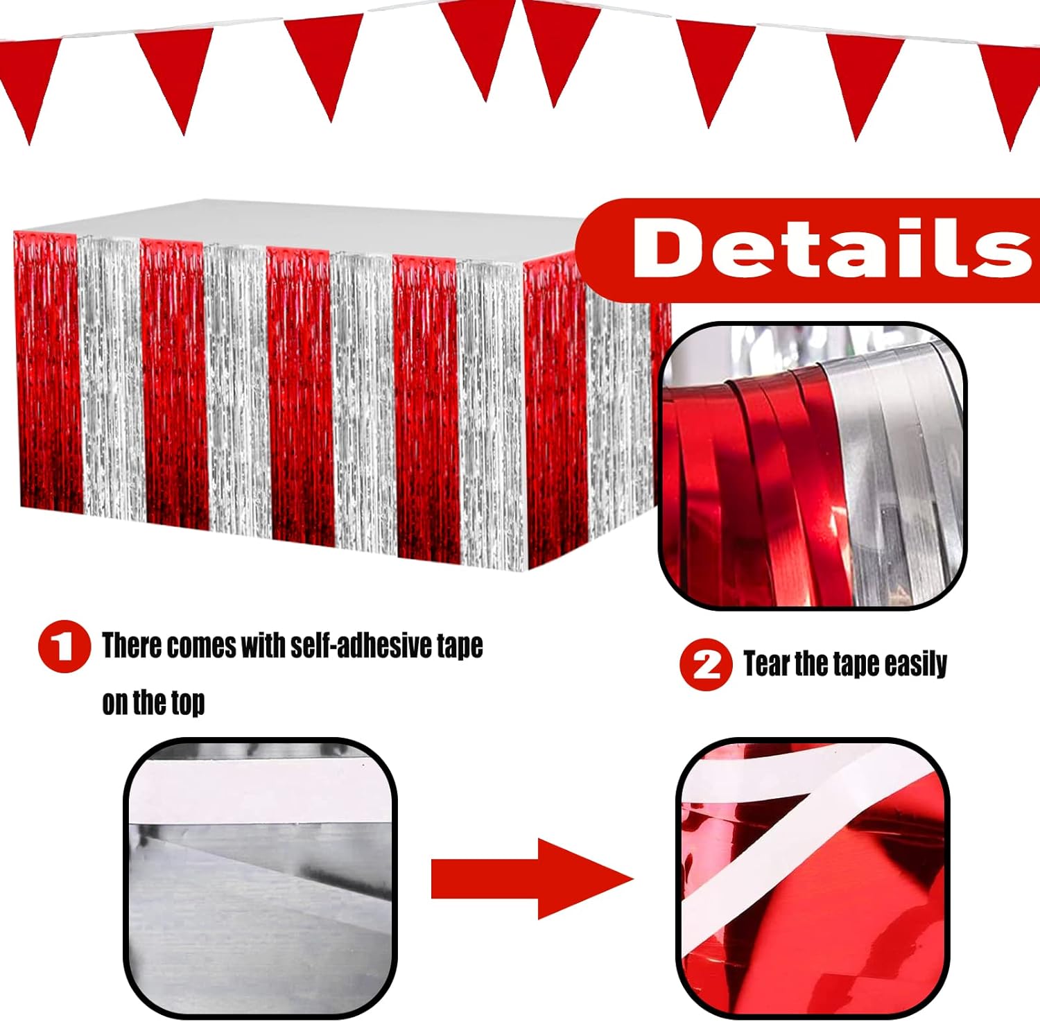 4 Pack 29x108 Inch Metallic Foil Fringe Tinsel Table Skirts for Rectangle Tables Streamer Backdrop for Wedding, Birthday, Parade Floats, Christmas, Halloween Party Decoration(Red Silver)
