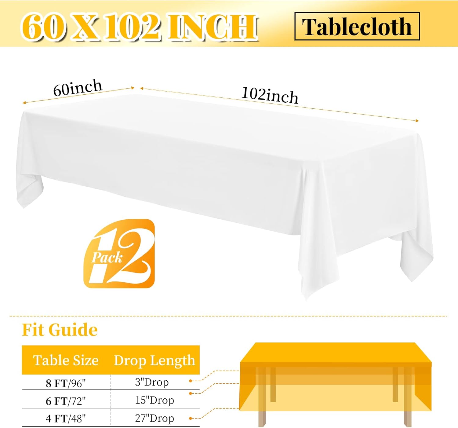 12 Pack 60 x 102 Inch Rectangle Tablecloth, White Tablecloth for 6 Feet Rectangle Tables,Polyester Tablecloth Washable Fabric Table Cloth for Wedding Dining Table Buffet Parties Camping