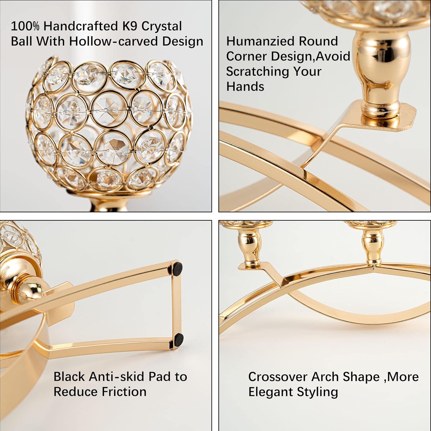- 【Extremely large crystal ball to accommodate more convenient candle placement】➢➣➤ Each globe measures 4" wide rather than 3" wide in market,The inner plate measures 2 1/4" diameter, so 2" candles fit perfectly. From the end of one globe to the next globe, measures 14", and the base is 16 1/4" by 3 1/8".This gold crystal candle holder is perfect for home or wedding, it's an elegant arch design with padded legs, so it won't scratch whatever surface you put it on.