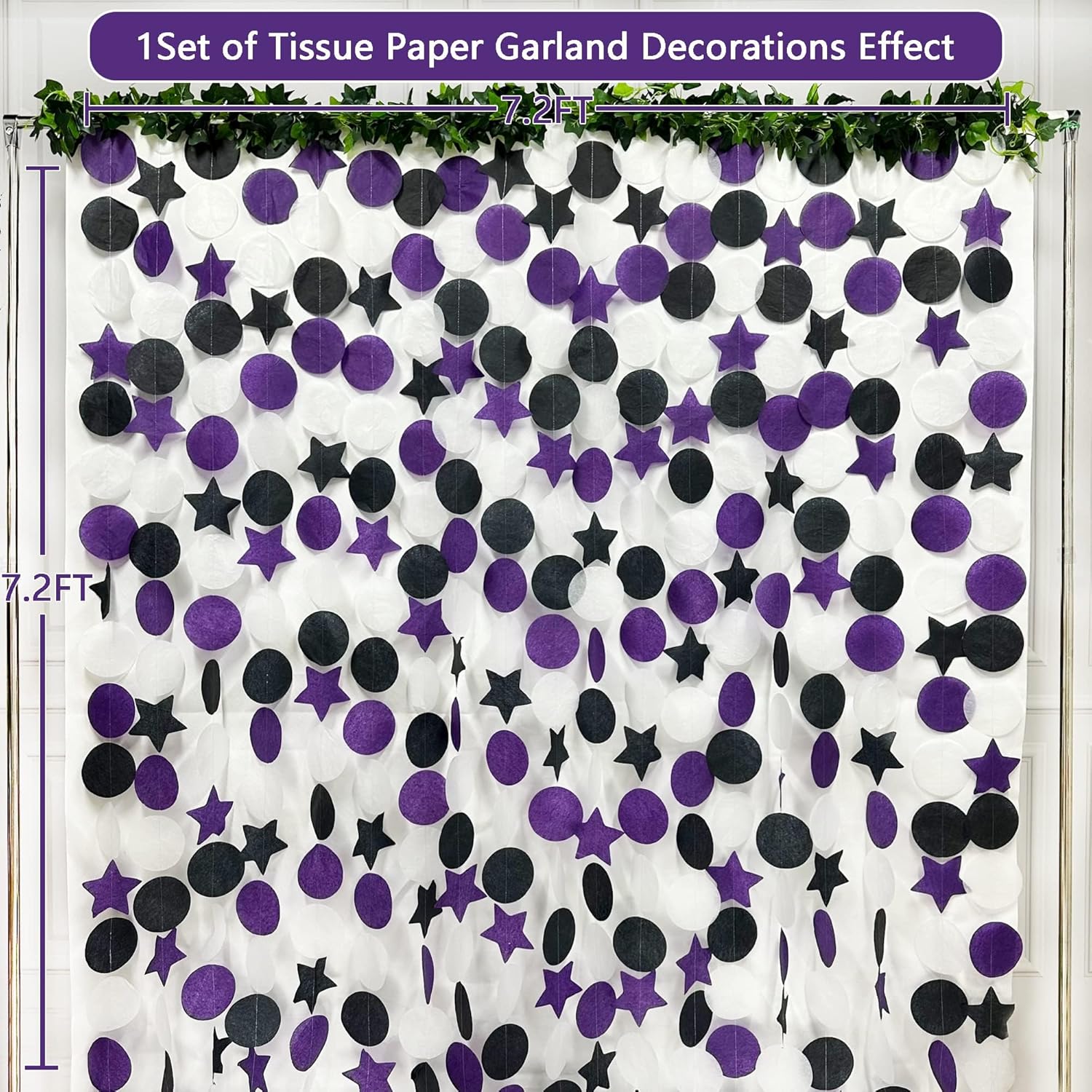- ⚫ENVIRONMENTAL MATERIAL-Our purple black and white big circle dot star streamer garland are made of high quality tissue paper,carefully hand-made and machine-sewn together with thread.durable and reusable.Unroll & unwrap the tissue paper garland carefully. Due to delicate nature of thread, may tangle.