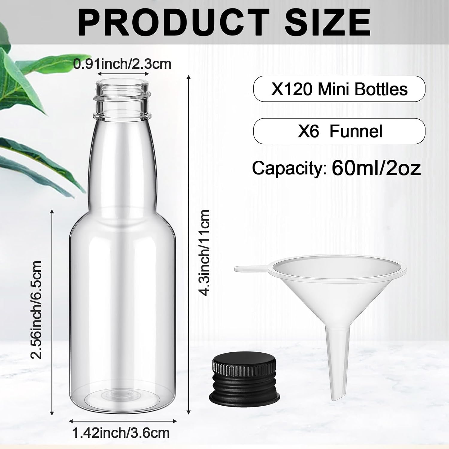 120 Pcs Mini Liquor Bottles Airtight Shot Miniature Empty Plastic Alcohol Spirit Shot Bottles with Funnels for Party Favors, Weddings(2 oz,Black)