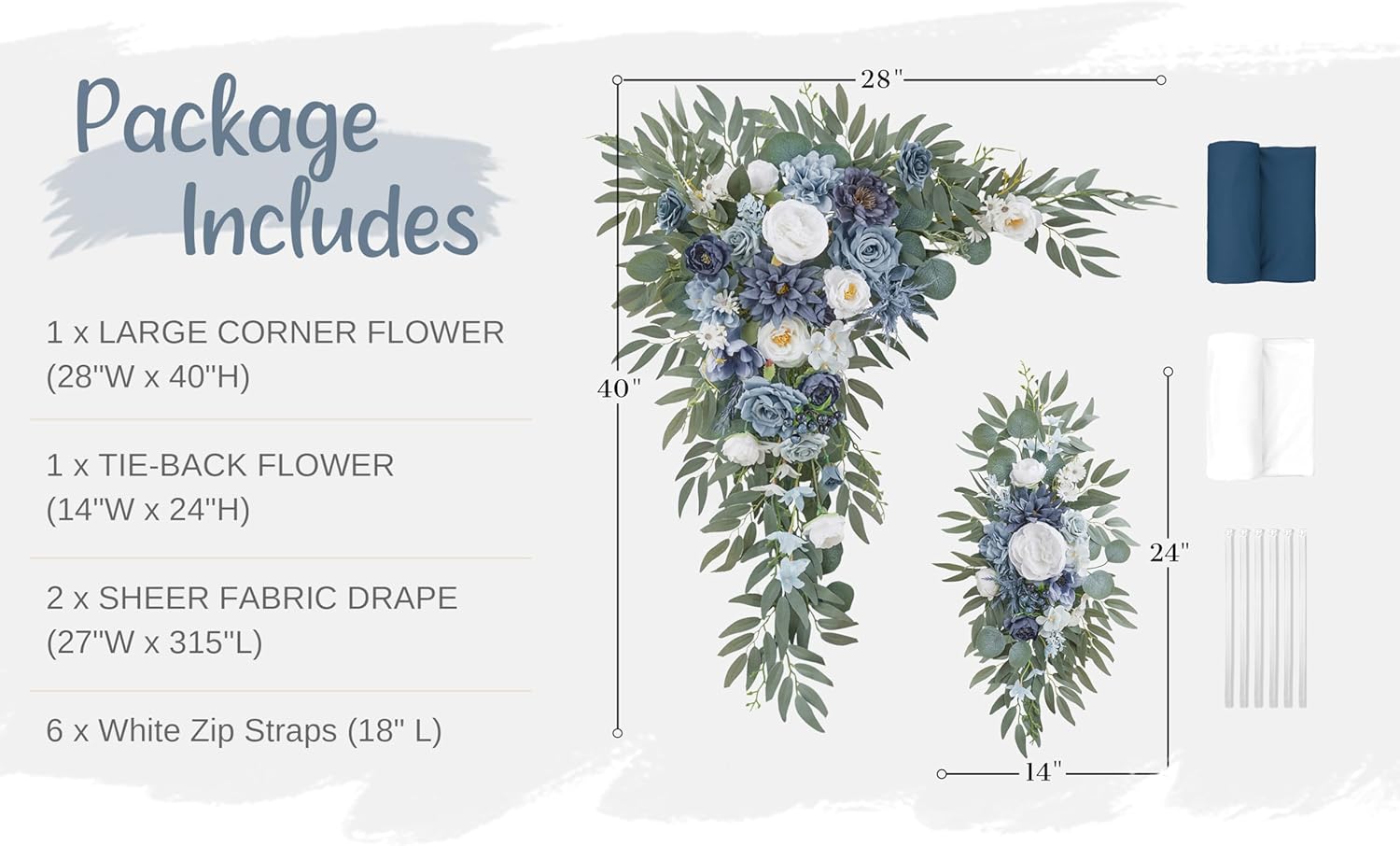 - PAKEAGE LIST: 1 x Large Corner Flower Swag of 28 "W x 40 "H + 1 x Large Tie-Back Flower of 14 "W x 24 "H + 2 x Hanging Sheer Drapes of 315 x 28 inch + 6 x White Zip Straps of 17.7 inch + 1 x Instruction Card + 1 x Glue Stick (Not include wood arch stand)