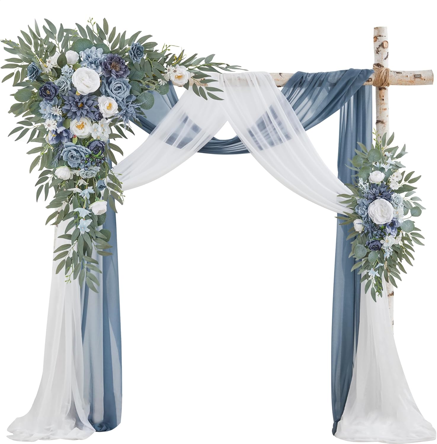 Wedding Arch Flowers with Drapes Kit (Pack of 4) - 2pcs Artificial Dusty Blue Deluxe Swag with 2pcs Sheer Drapes for Wedding Ceremony Arbor Reception Backdrop Rose Floral Decoration