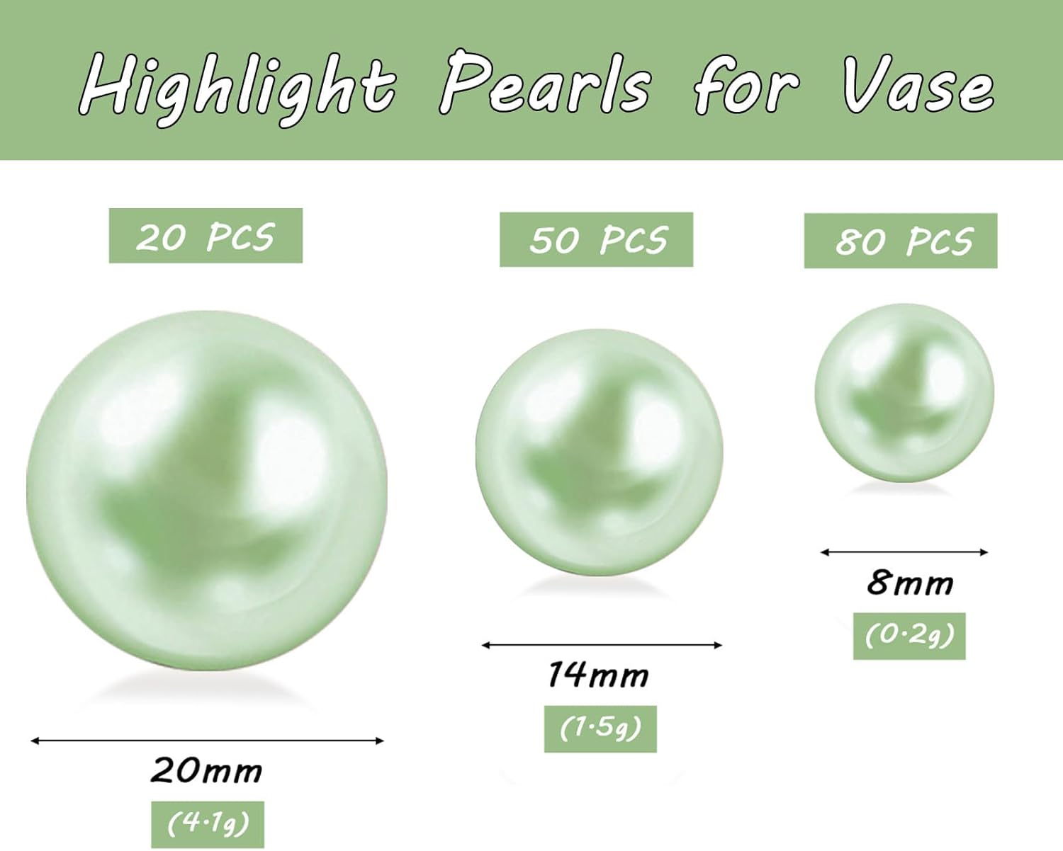 150Pcs Light Green Polished No Hole Faux Pearl Beads for Vase Filling Decorations, Plastic Pearls Vase Fillers, Table Scatters, Wedding Centerpiece, Home Decor, 8/14/20 mm