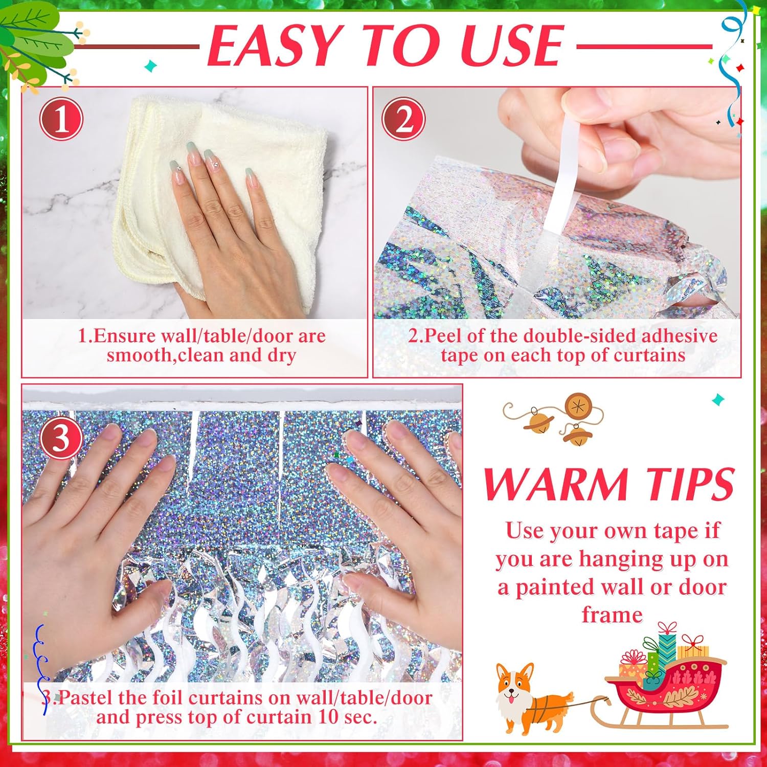- Easy to Assemble: the tinsel curtain backdrop has a tape behind it for you to stick on decorative places such as walls, windows, tables and doors to create a silver world, full of romantic atmosphere, so that you and your partners can have fun, and you can take pictures for memory