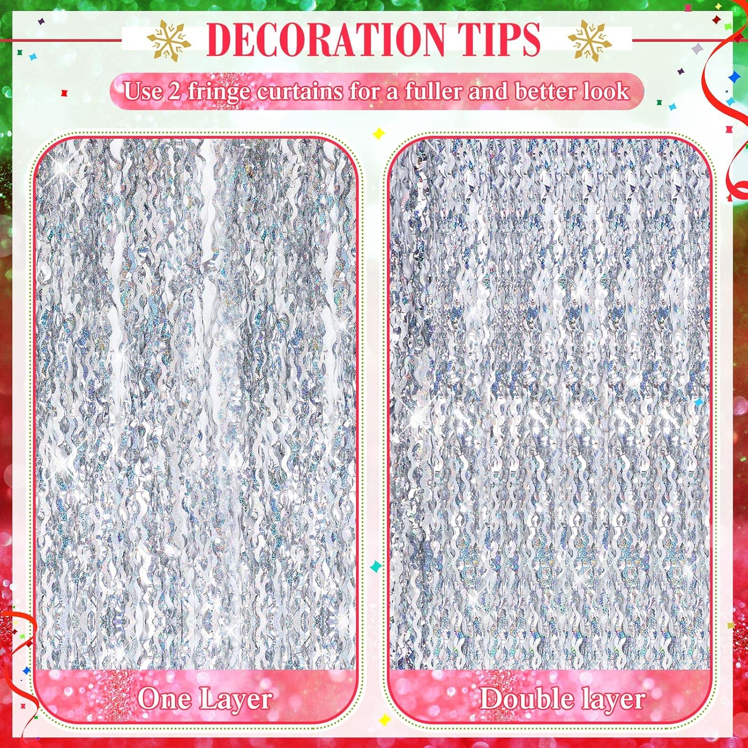 - Using Tips: metallic foil fringe backdrops are easy to cut, and you can cut the ribbon into desired width and length with scissors, and you can put multiple curtains side by side to make the background bigger or fold multiple curtains together to achieve a thicker effect, giving you better visual pleasure