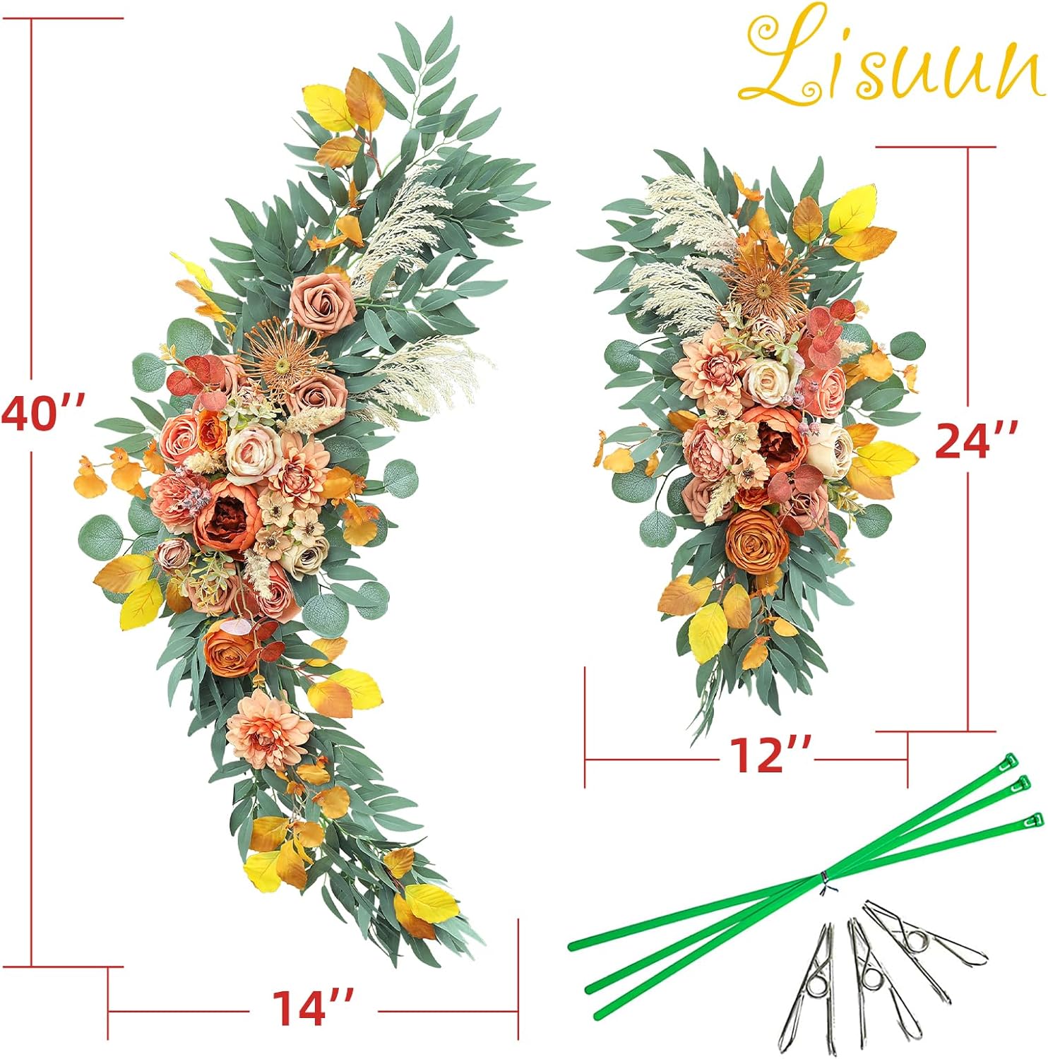 - Enlarged Size:The large flower swag design straightens measures 40" long x 14" wide(100*35cm), small flower tie measures 24" long x 12" wide(60*30cm),the larger size contains more flowers and decorations, let your wedding ceremony more colorful atmosphere.