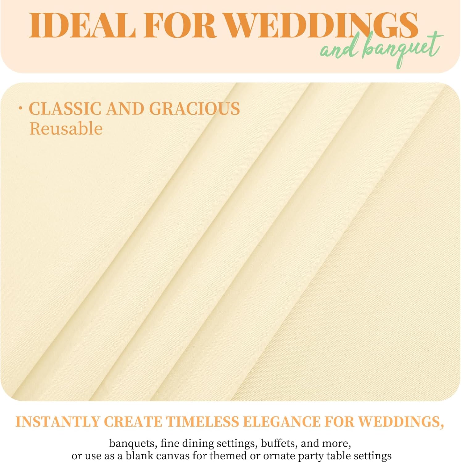 - š„ćPremium Tablecloth FabricsćYou can get 12 pieces Beige tablecloth, our tablecloth is made of soft 180 GSM 100% premium polyester fabric that resists wrinkling for an always crisp, polished look. These materials are as skin-friendly as they are environmentally friendly. Protect and decorate your tables.