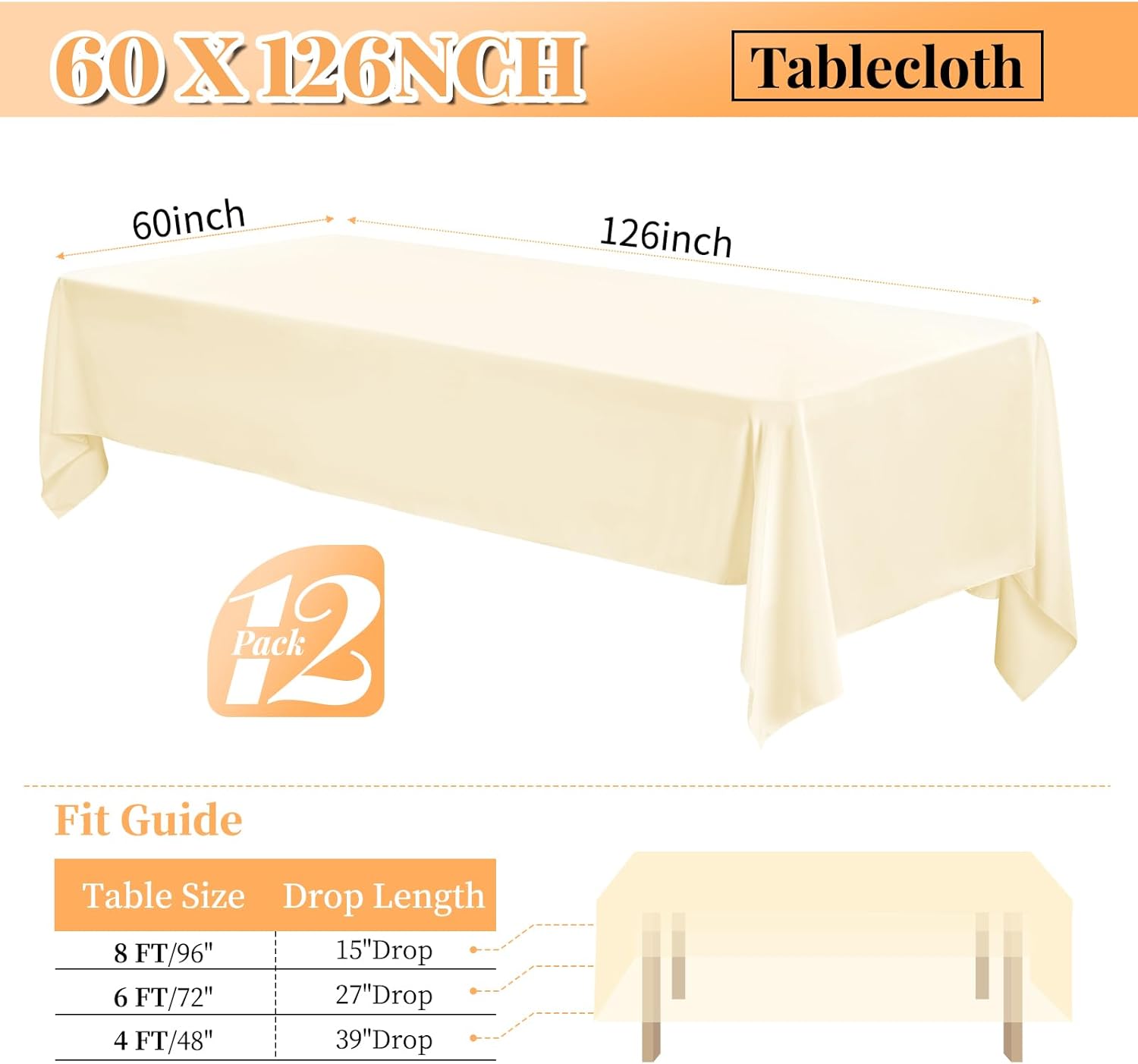 - š„ćSizećThis Beige table cloth is 60x126 Inch, for standard 8ft table, providing 15 inch drop. We can provide the following sizesļ¼Rectangular: 60" x 102", 60" x 126", 70" x 144", 90" x 132",90" x 156". Round: 60", 90", 108", 120".Please measure the size of your table before purchasing.