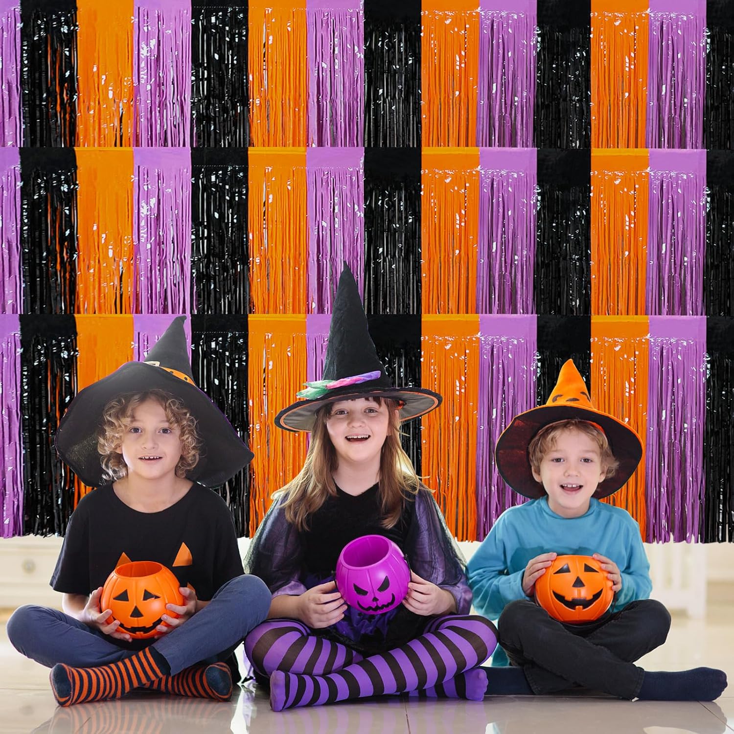 6 Pack 30x108 Inch Halloween Table Skirt Decoration, Metallic Foil Fringe Tinsel Table Skirts, Curtains Backdrop Parade Floats Birthday Halloween Christmas Party Decoration(Black Orange Purple)