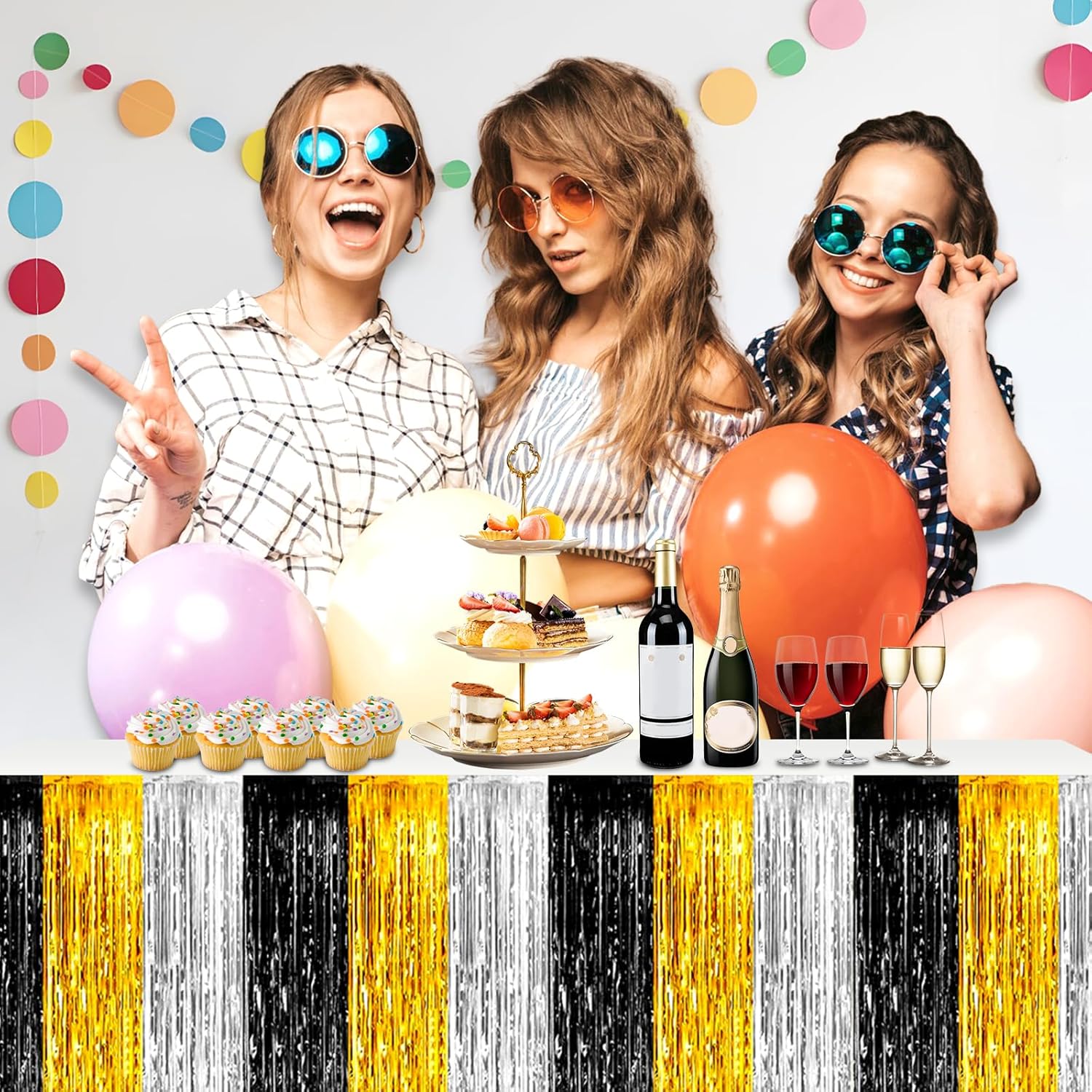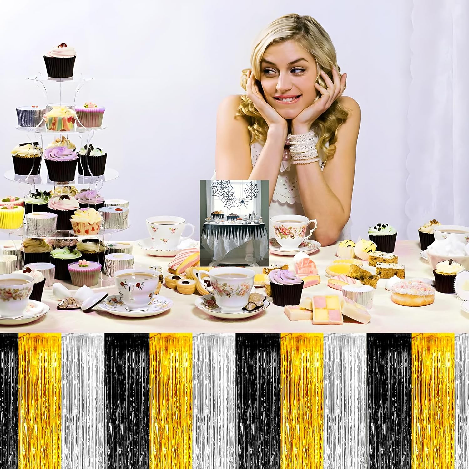 3 Pack 29 x108 Inch Black Gold Silver Foil Fringe Table Skirts Metallic Banner for Tinsel Streamer Garland Backdrop for Parade Floats Wedding Thanksgiving Birthday Christmas Halloween Party Decoration