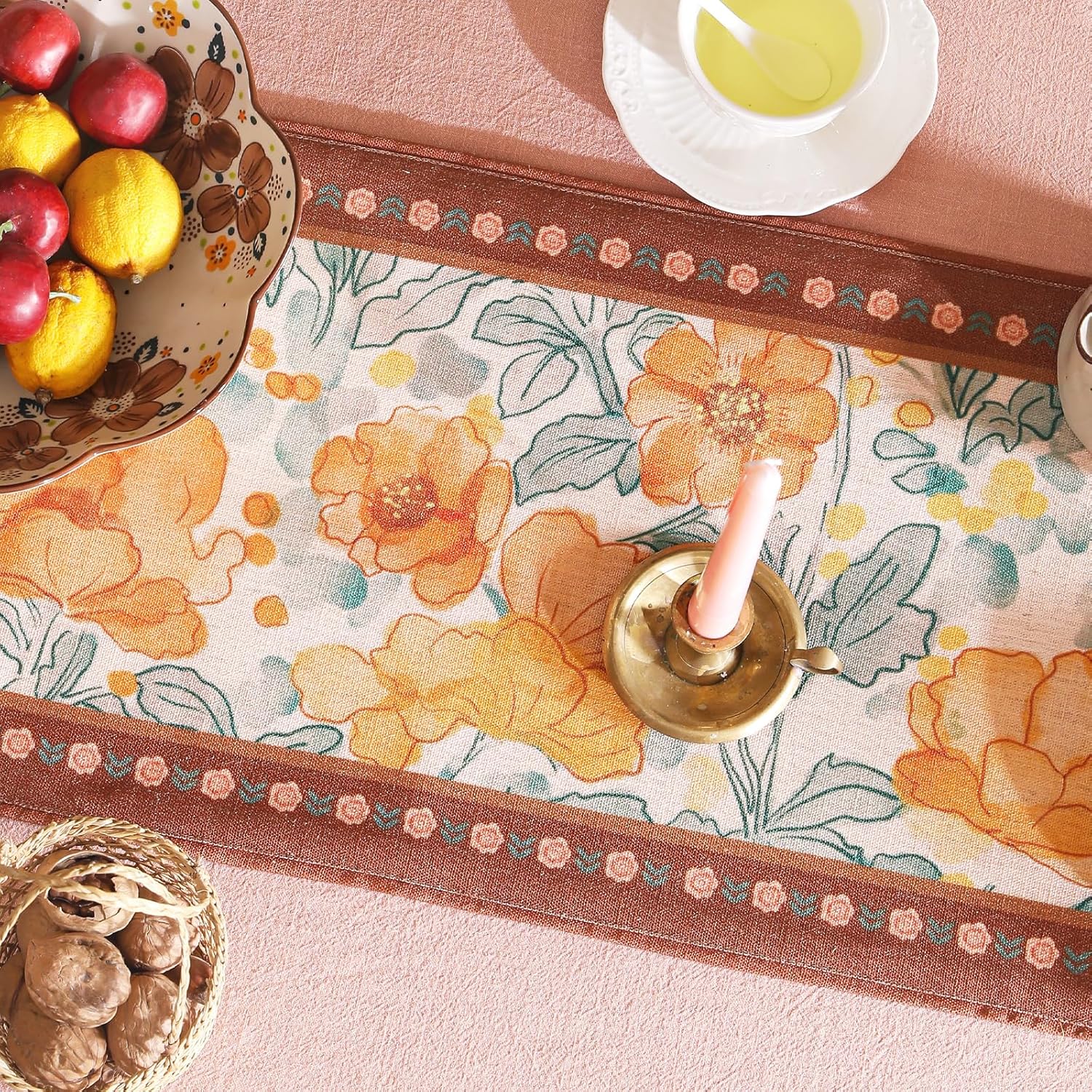 Designer Vintage Orange Floral Table Runner,French Soft Linen Farmhouse Table Runners 71 Inches Long,Decor Tabletop for Kitchen,Dining,Tea Party,Home,Christmas,12"*71"