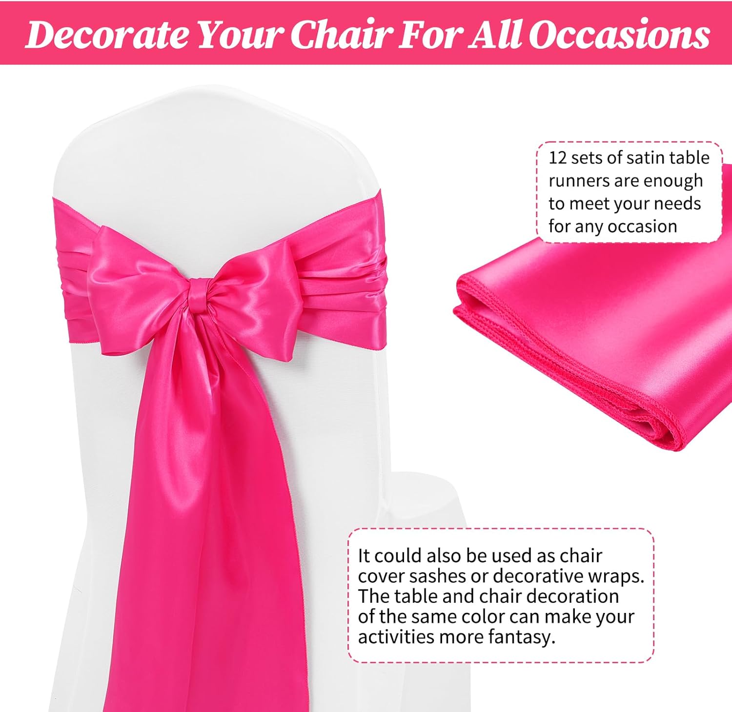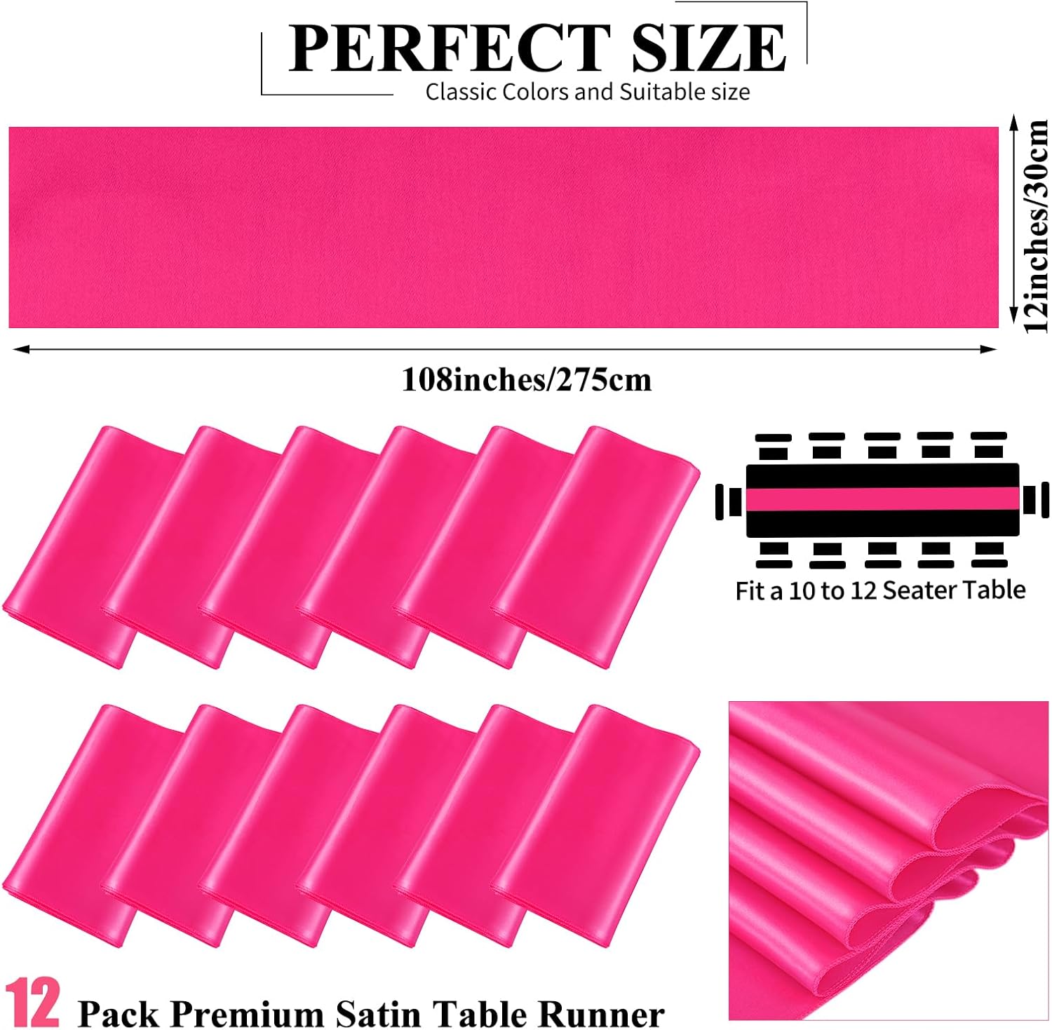 - 🍷【Set includes】12 Pack hot pink satin table runner measures 12" x 108" in size, appropriate for a table that can seat 8-10 people. This satin table runner can fit a 6ft/8ft rectangular table or round table well.This satin table runner is great for event table decorations.Our satin table runner make your dining table more dazzling and outstanding. Purchase ur 12piece satin table runner and save even more.