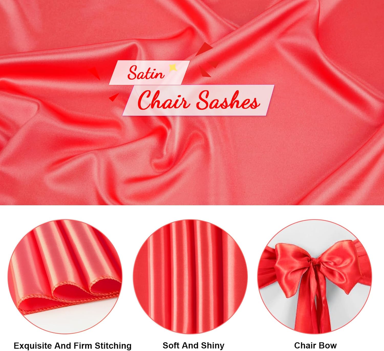 - Size & Package:You will get 10 pieces red satin chair sashes, and the size is about 108" x7" or 275cm(l) x 17cm(w). These chair ties adopt flating packing, please to tie the bow by yourself. Each package includes chair sashes only, no chair covers