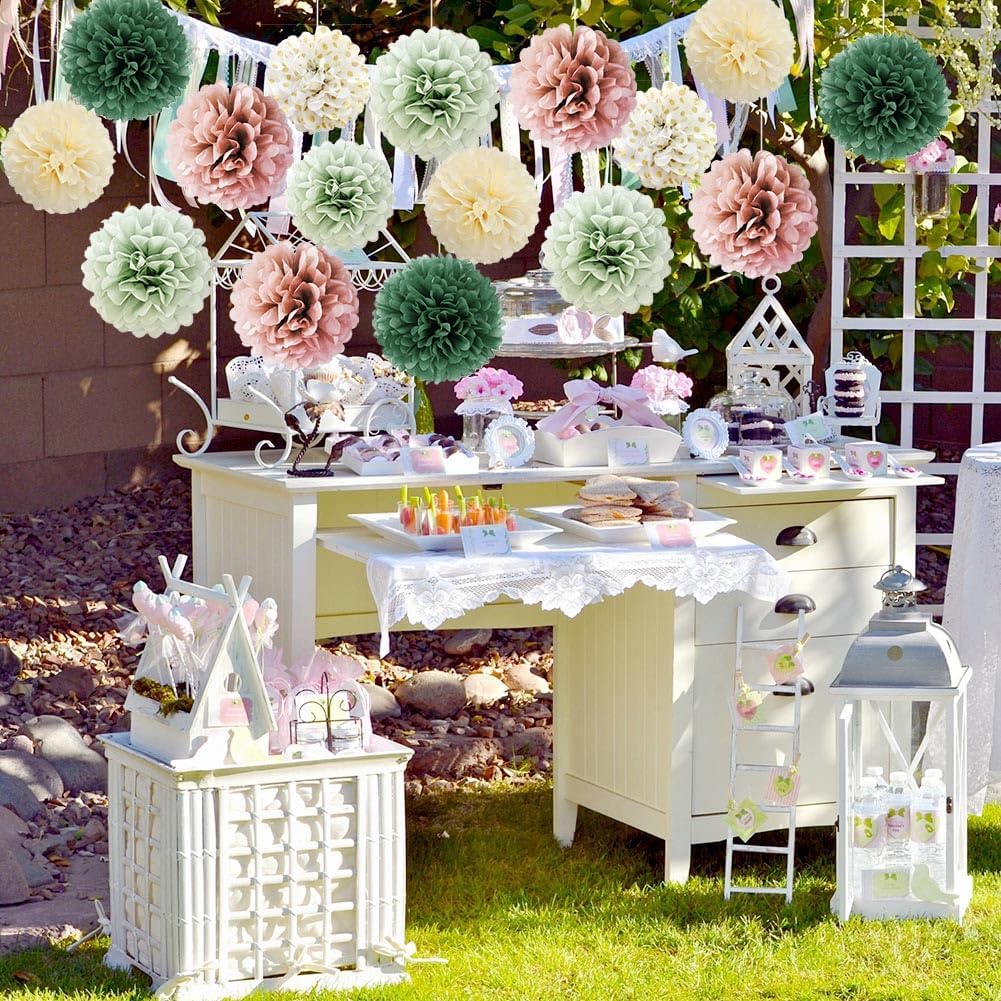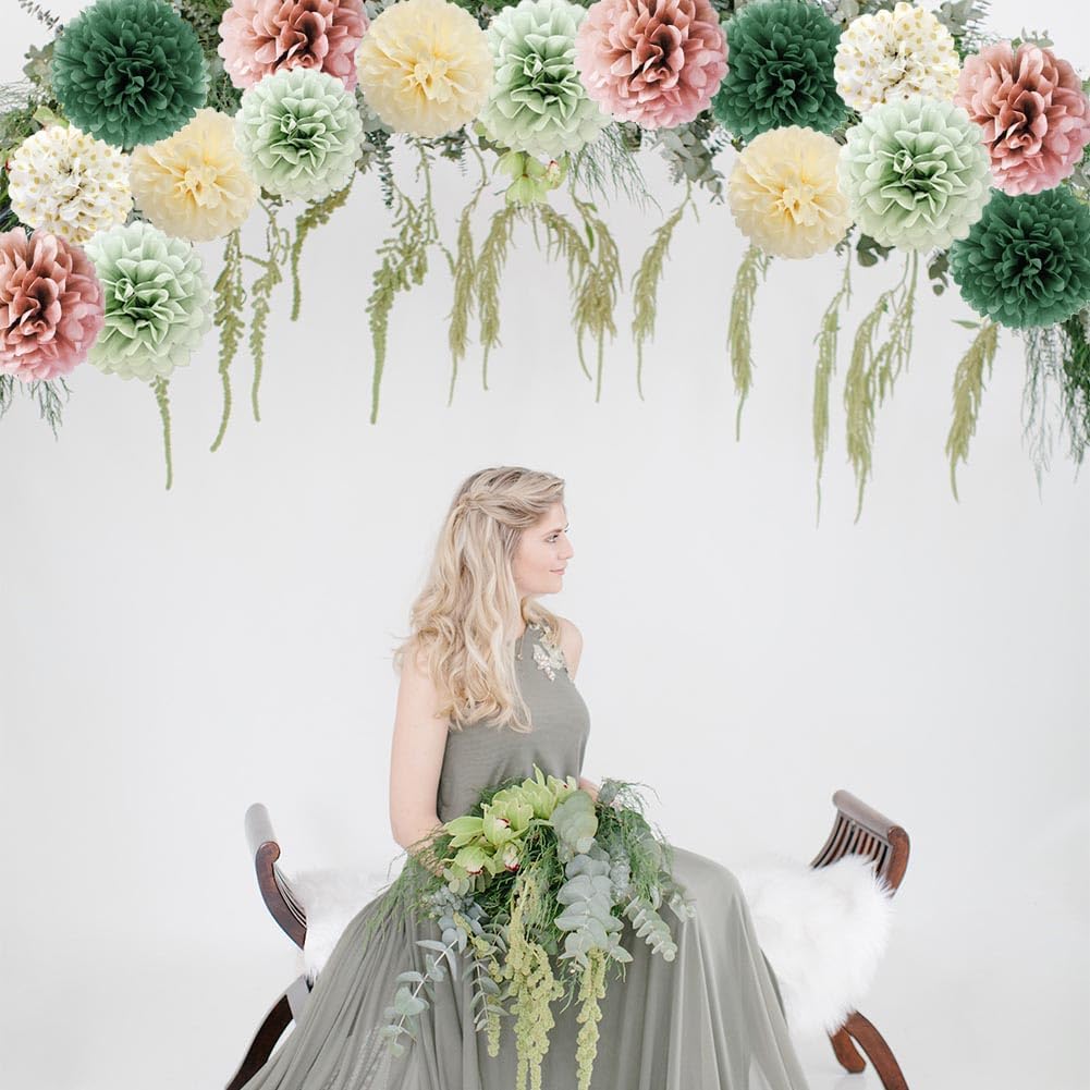 - 【Multi-Occasion】 These tissue paper pom poms flower balls are perfect for sage green and blush pink birthday party decorations, dusty rose and sage green wedding decorations, sage olive green pink baby shower decorations, dusty rose and sage green bridal shower decorations, or any other kinds of parties. It's also a great idea for baby room, you could use it anywhere according to your need and your preference