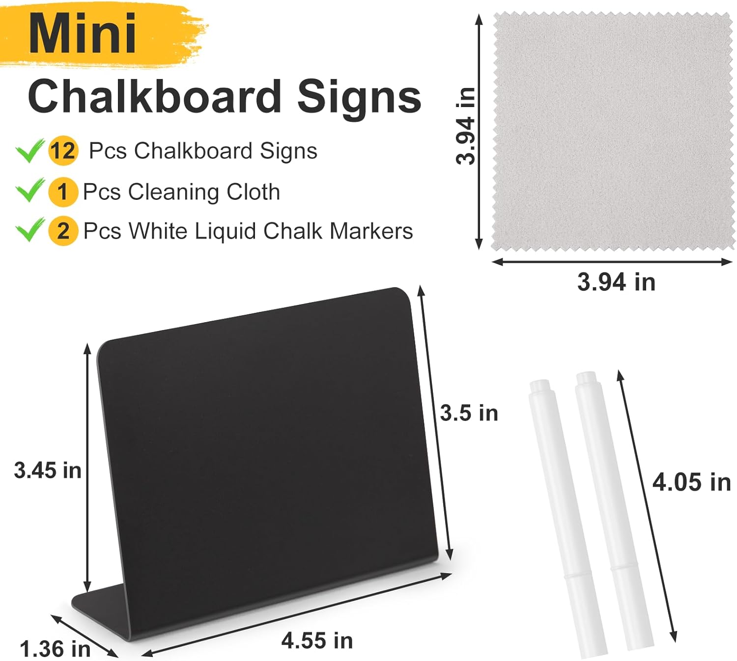 - Ideal Dimensions: The 12 pcs PVC mini chalkboard signs are all 4 in x 3 in, 2 pieces of liquid chalks are both 4 in x 0.4 in and 1piece of rag is 4 in x 4 in