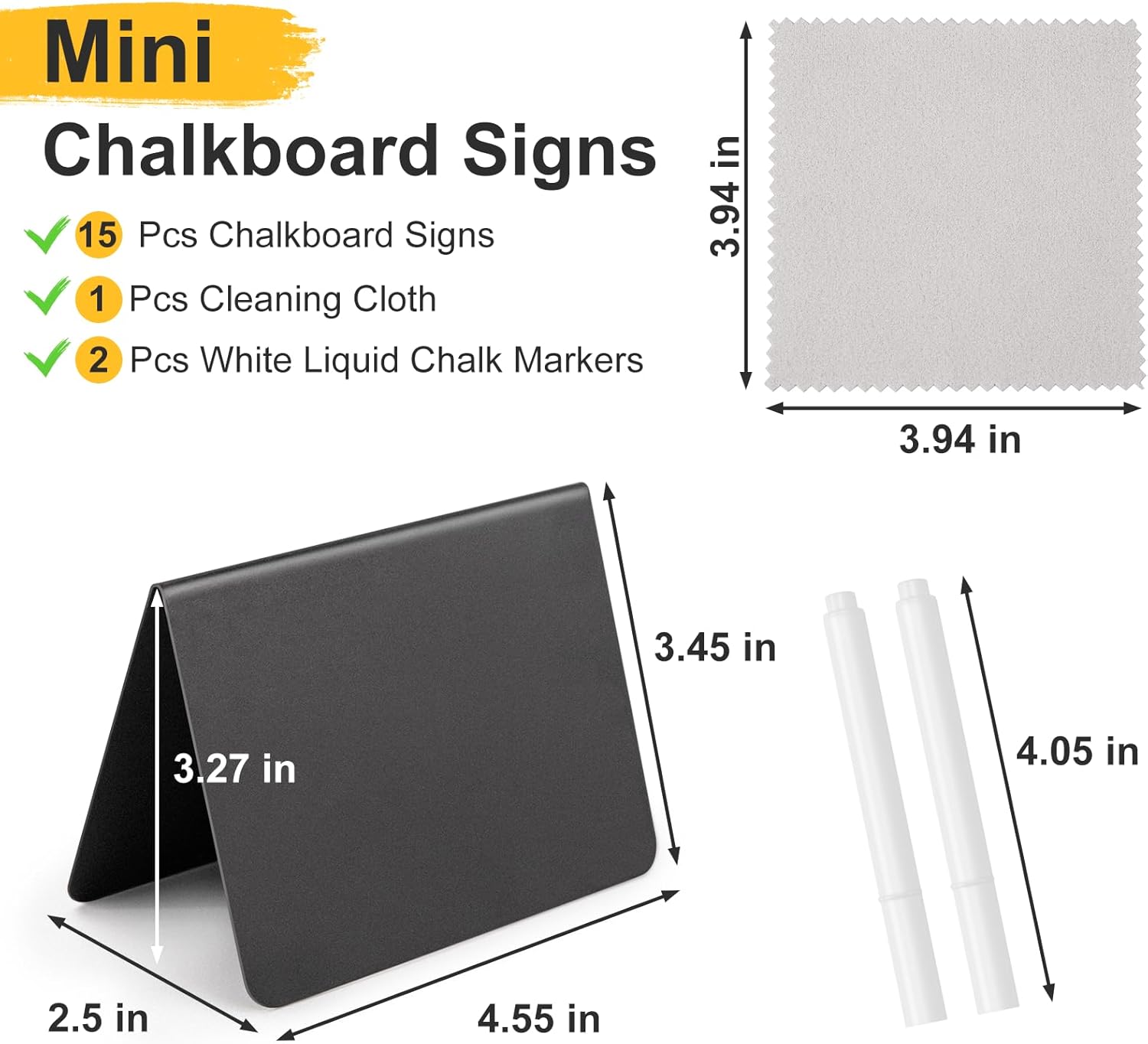 - Ideal Dimensions: The 15 pcs PVC mini chalkboard signs are all 4 in x 3 in, 2 pieces of liquid chalks are both 4 in x 0.4 in and 1piece of rag is 4 in x 4 in