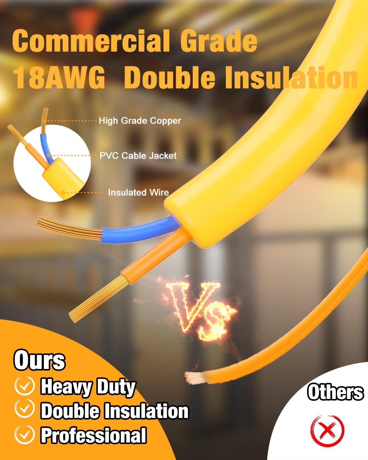 - ใCommercial GradeใAdopts SJTW 3/18 AWG heavy-duty wire and high-precision oxygen-free tinned copper material for lower resistance and higher conductivity. IP65 waterproof tech can withstand extreme weather conditions and IK08 protection is enough to withstand shocks and vibrations, no need traditional cage and worry about bulb aging and damage. Sturdy and durable structure enhances the service life of the construction lights up to 50,000 hours.