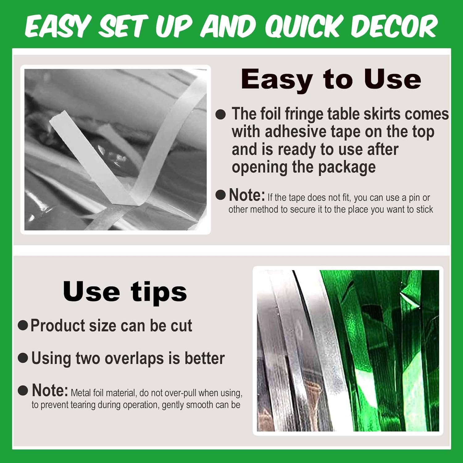 - Easy to Use: Tinsel foil fringe table skirts streamers the back has double-sided tape, gently peel double-sided tape off and it would be very easy to paste on wall, window, table, door, parade float or anywhere you want to decorate, add some festive atmosphere to the party