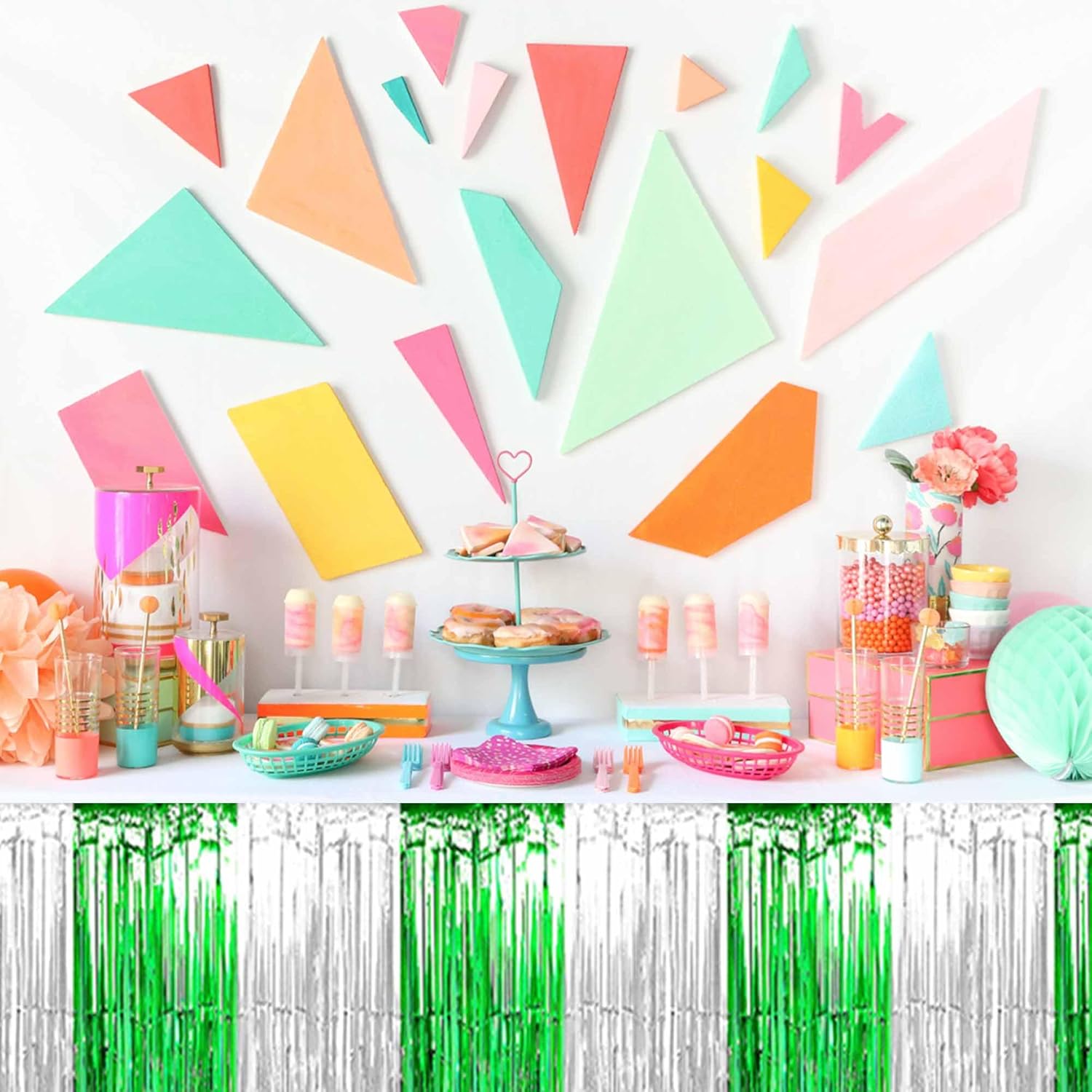 3 Pack Silver Green Foil Fringe Table Skirts Metallic Tinsel Streamers Garland Banner Backdrop for Table Decor, Parade Float, Birthday, Wedding, Halloween, Christmas Party Decorations(29x108 In)