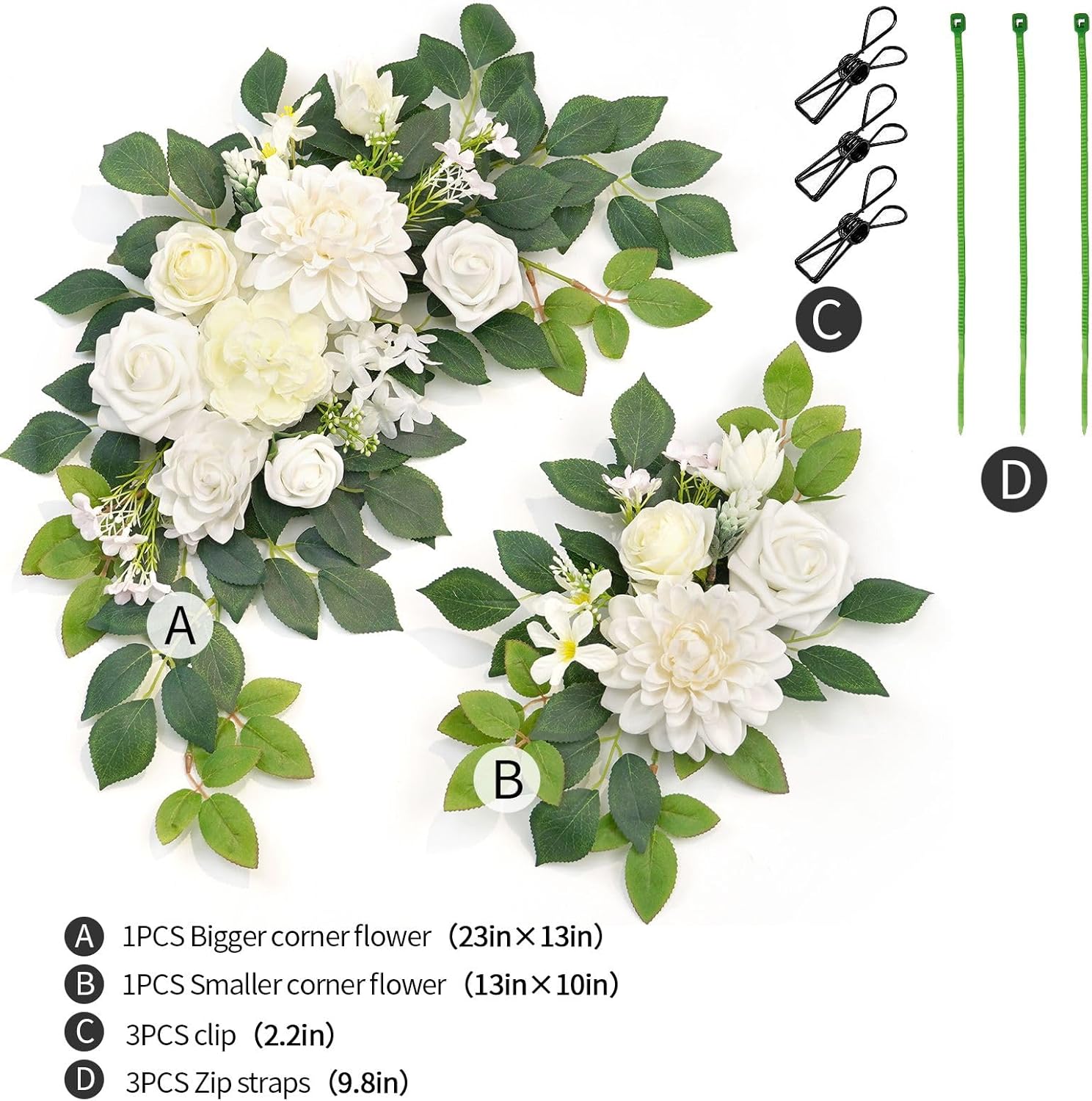 - Included Components : 2 x Pre-fabricated flower swag, 3 x cable zip tie, 3 x metal clips