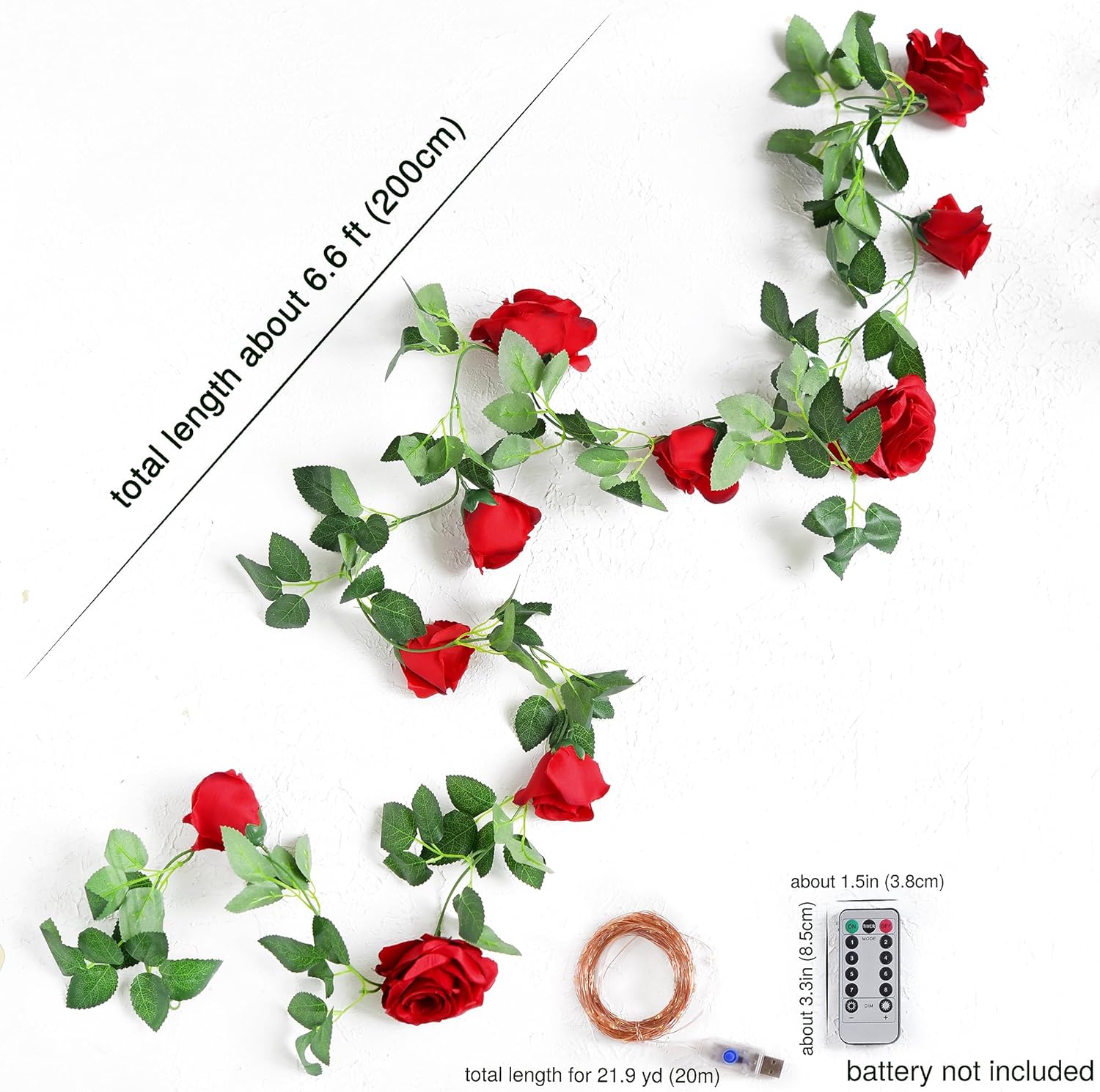 FiveSeasonStuff 29 Ft 4 Pack Christmas Red Rose Silk Flower Garland Artificial Flowers Decoration Hanging Floral with 66 feet String Lights