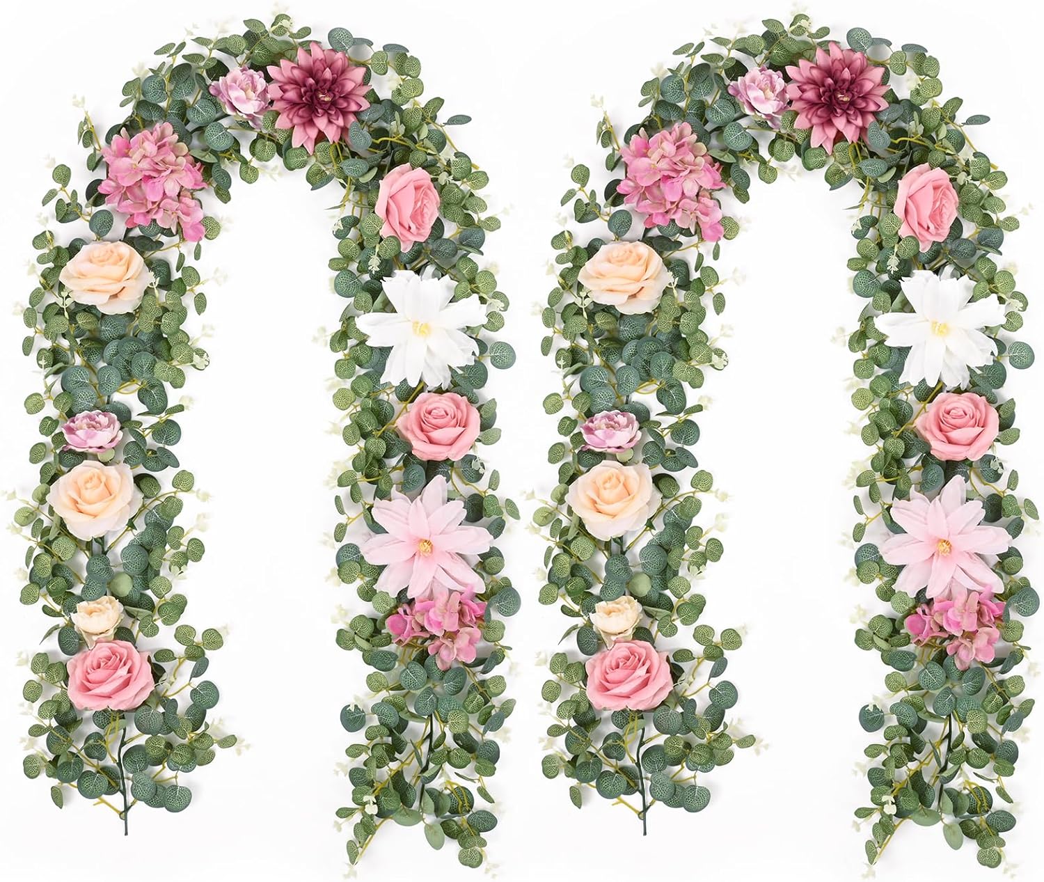 - 💗ABUNDANT FLORAL MATCH: Indulge in the enchanting variety of our eucalyptus garland with flowers. We've handpicked romantic roses, sumptuous peonies, delicate hydrangeas and majestic dahlias to intersperse among the eucalyptus foliage. Create a different full layering and sense of romantic.