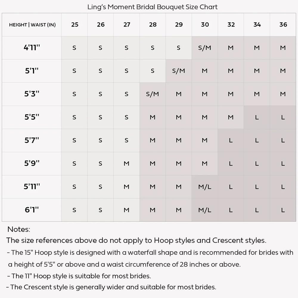 - Size: This Wedding Bouquets for Bride is approx. [13 inches W x 20 inches H]. Handle length 4.3inch. With ribbons card. This size is typically suitable for most brides to carry, this one is recommend for 4'11"-6'1"height and 25" waist, 4'11"-6'1"height and 26" waist, 4'11"-5'7"height and 27" waist, 4'11"-5'3"height and 28" waist, 4'11"-5'1"height and 29" waist, 4'11"height and 30" waist.