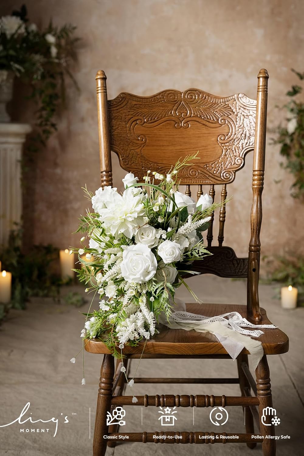 - COLOR INSPIRATION & VERSATILITY: Design a classical romance with May Lily & Olive collection. Delicate white flowers, like Roses and Lily of the Valley, combine with gentle olive greenery to tell your timeless love story. Itโs perfect for both indoor and outdoor wedding ceremonies in any weather, bridal showers, and photoshoots. It can be used as a fall bridal, bridesmaid bouquet, toss bouquet, or a prop for wedding photography.It can also be displayed in a vase as part of your home dรฉcor.