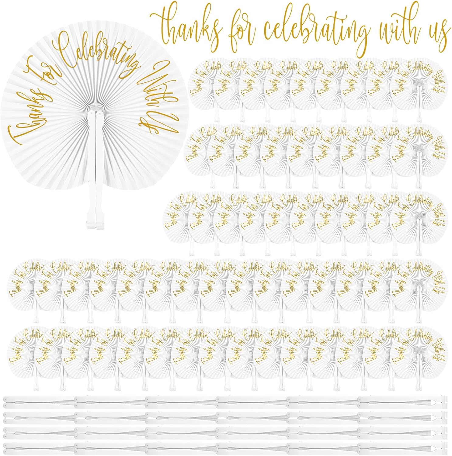 - Generous Pack of 120: our package includes 120 pieces of wedding white folding fans, each elegantly printed with the heartwarming message 'Thanks for Celebrating with Us' and comes with a gift bag; wedding fans are suitable for distributing among guests at wedding parties, bridal showers, or summer parties, adding a sweet atmosphere to your special events