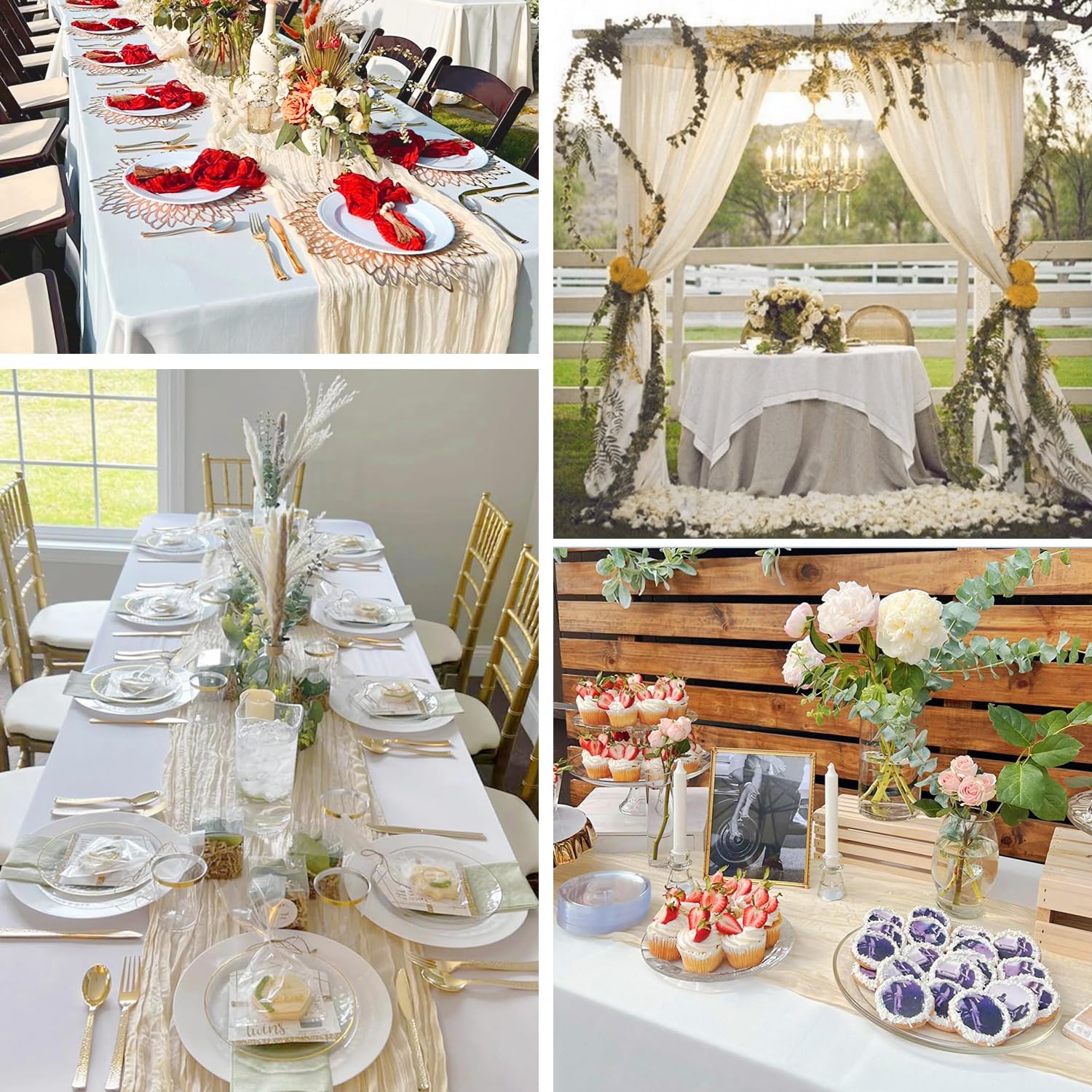 - 🌟【Versatile Natural Cheesecloth Table Runner Bulk】Beige cheese cloth table runner cream looks nice on various occasions, such as wedding, baby shower, bridal showers, birthday parties, theme party, engagement banquet, candy buffets, the top of the piano, fireplace, dessert tables, weddings arch, Valentine's Day, Thanksgiving, Christmas and other special occasions. The pretty table runner well decorates home, hotel, wedding, parties, grand estates and gardens and more, that makes your life chic.