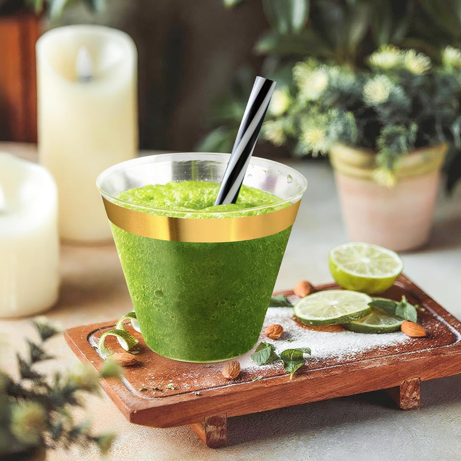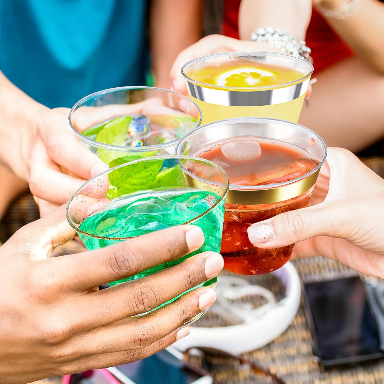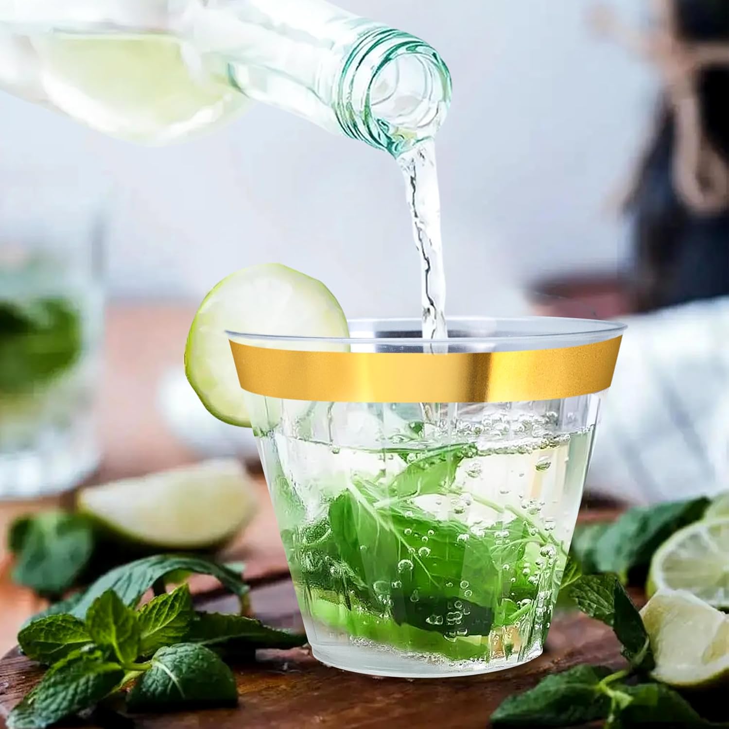 - 100% Food Grade Cups: Made with high-quality PS6 material, these gold rimmed plastic cups are BPA-free. They are impact and crack resistant, making them a solid choice for your beverage.