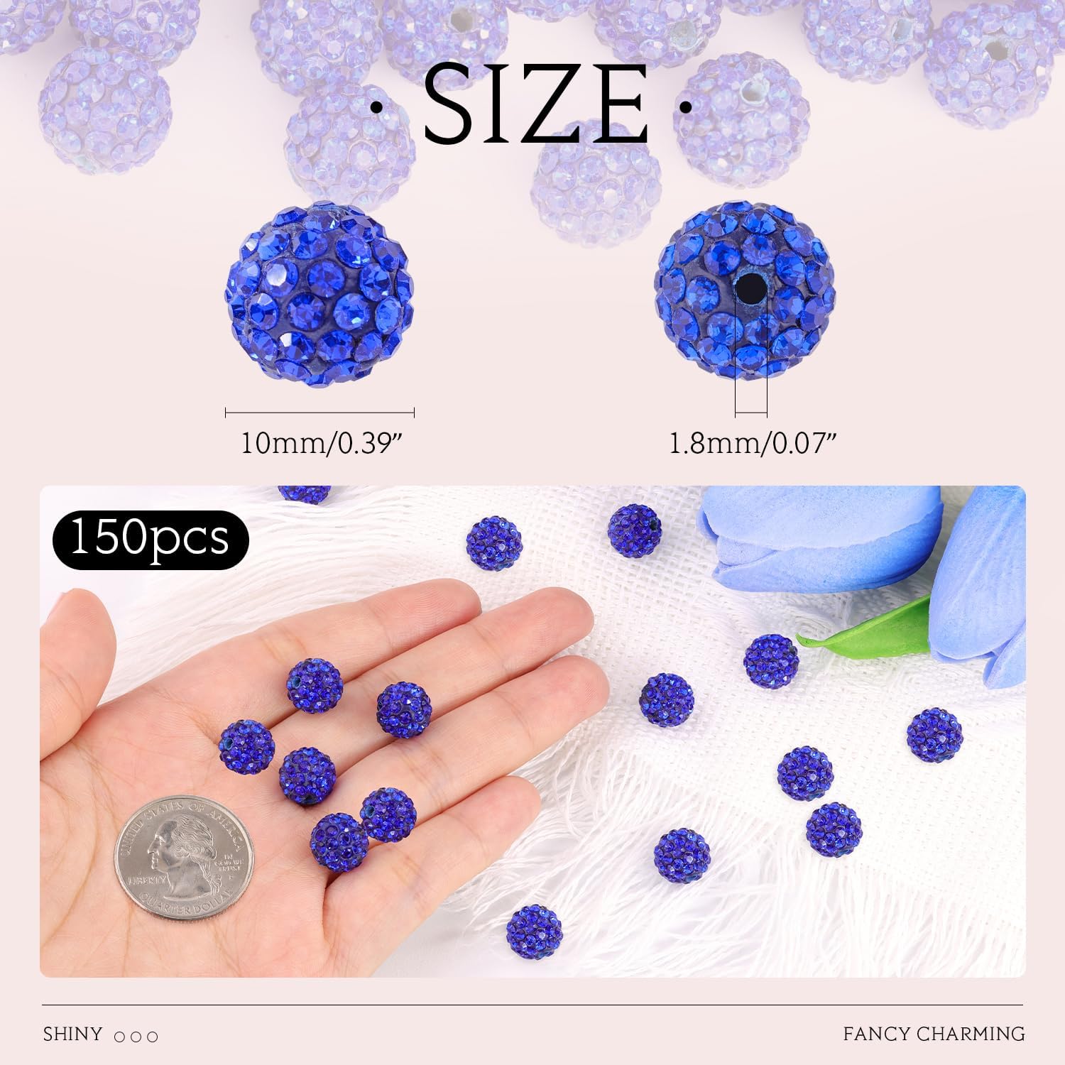 150 pcs 10mm Rhinestone Beads for Jewelry Making, Dark Blue Shiny Round Shamballa Disco Beads Bulk, Sparkle Crystal Clay Christmas for Bracelet Baseball Necklace Earring Crafting and DIY