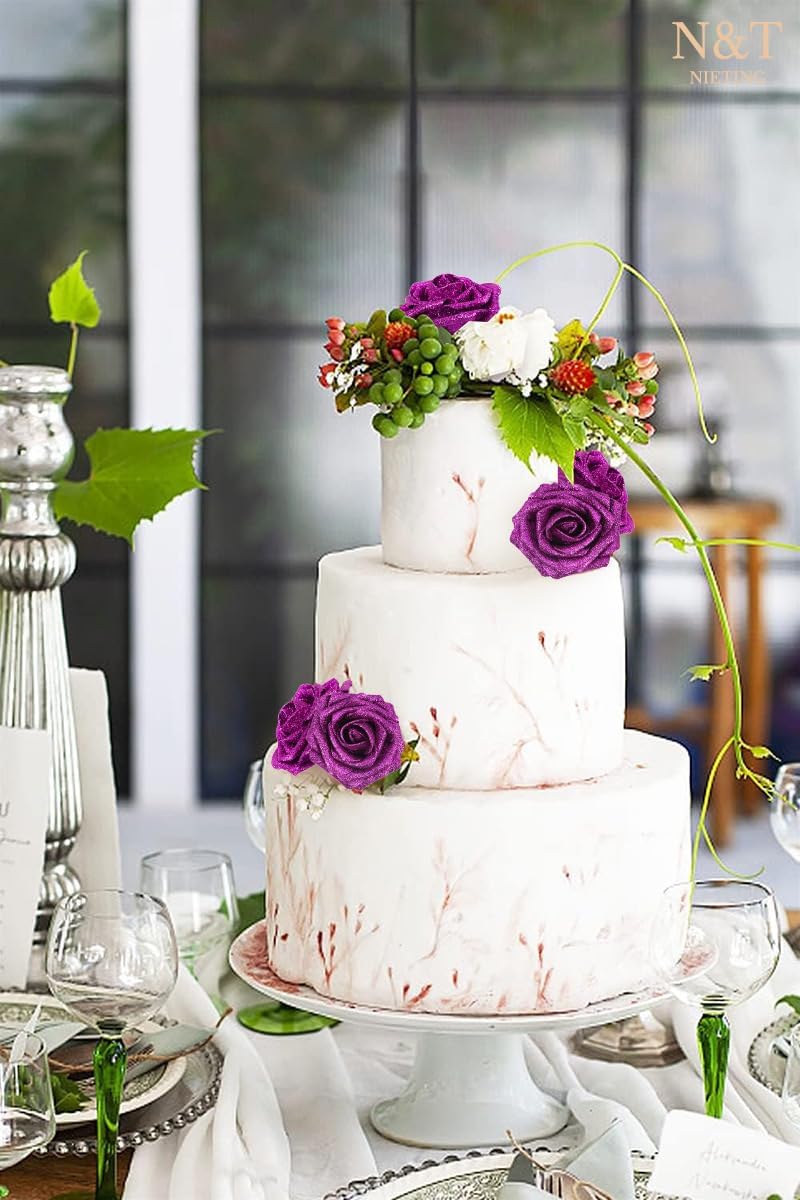 N&T NIETING Artificial Flowers Glowing Purple Flowers Foam 25pcs Glitter Roses Real Looking Fake Roses with Stem for DIY Wedding Bouquets Centerpieces Bridal Shower Party Home Decorations
