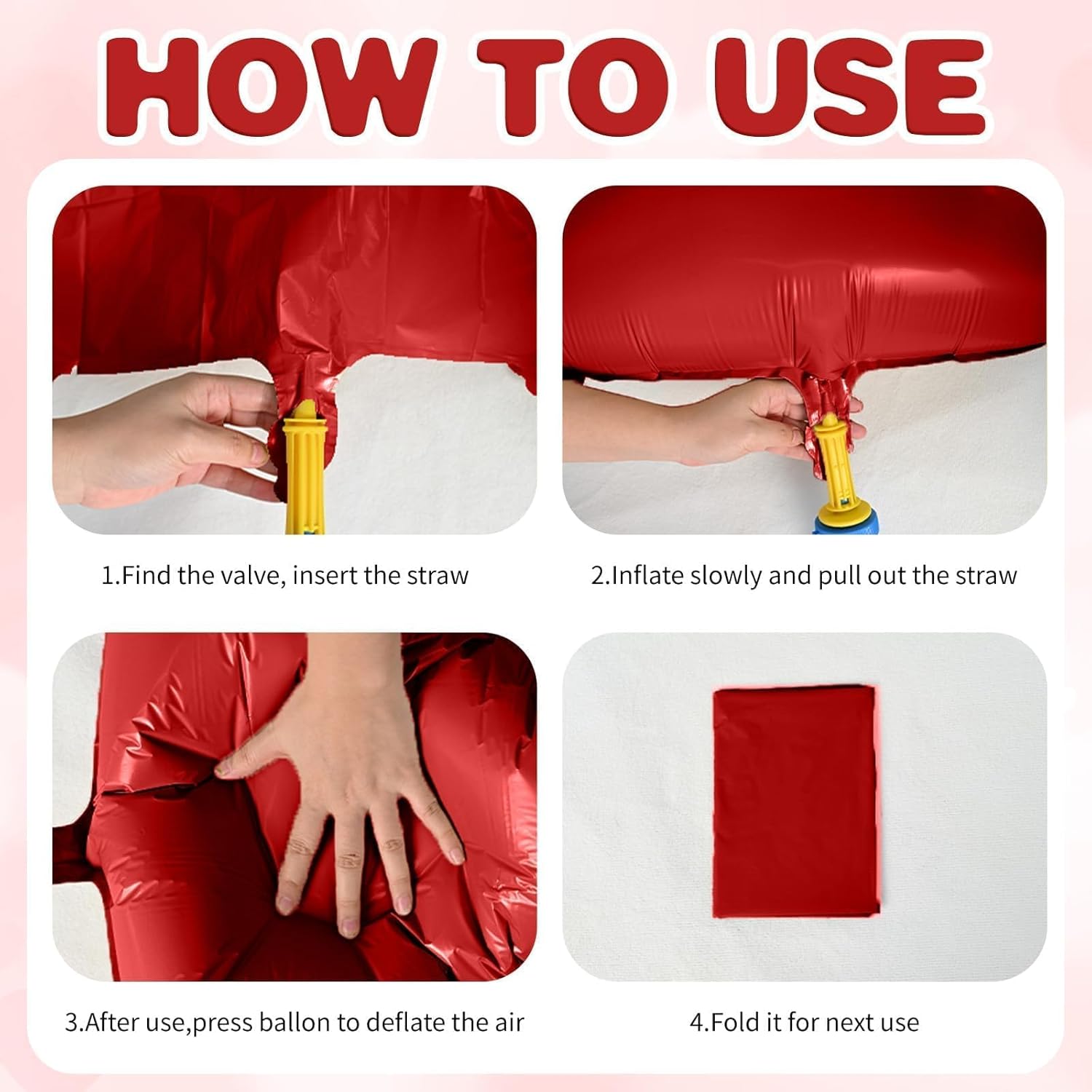 - Easy To Use:These red heart foil balloons are suitable for helium or air. Easy to inflate using the a straw or an air handheld pump. This heart foil balloon adopts self-sealing design, you only need to press the inflation port to seal it after finishing inflate. The balloons are reusable and can be folded up for next use after being deflated with a straw.
