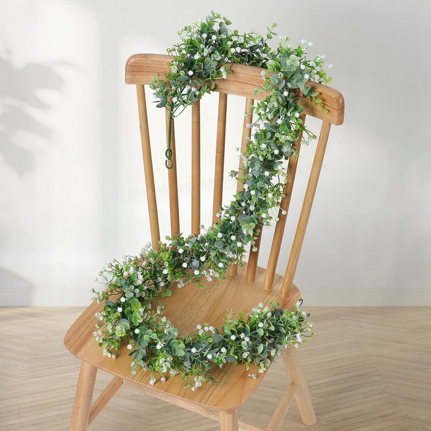 - 【PACKAGE & SIZE】: Package includes 4 packs artificial eucalyptus garlands with white flowers. Each leaves garland is 6 feet/180cm long, 4 packs total length is 24 feet. They can be twisted together to look denser.